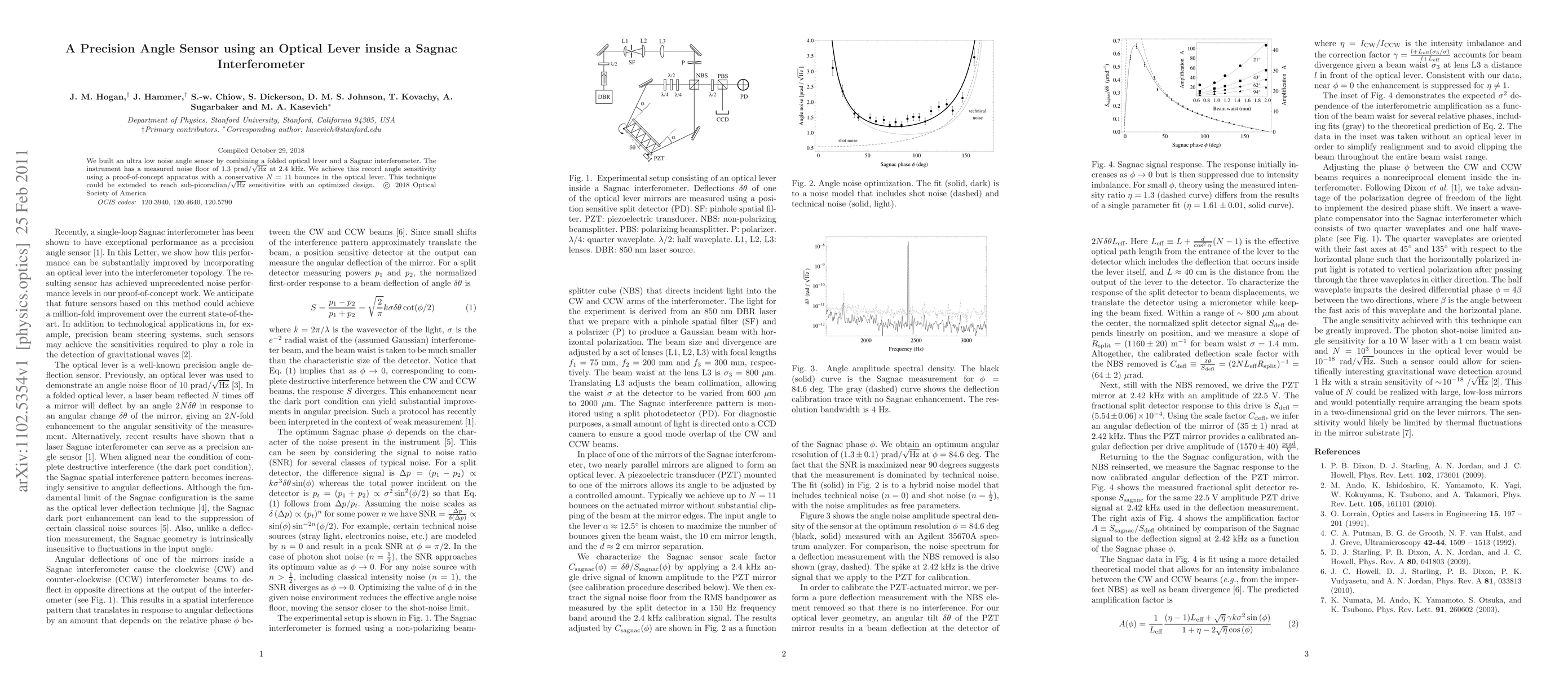 We built an ultra low noise angle sensor by combining a folded optical lever and a Sagnac interferometer. The instrument has a measured noise floor of 1.3 prad / Hz^(1/2) at 2.4 kHz. We achieve this record angle sensitivity using a proof-of-concept apparatus with a conservative N=11 bounces in the optical lever. This technique could be extended to reach sub-picoradian / Hz^(1/2) sensitivities with an optimized design.