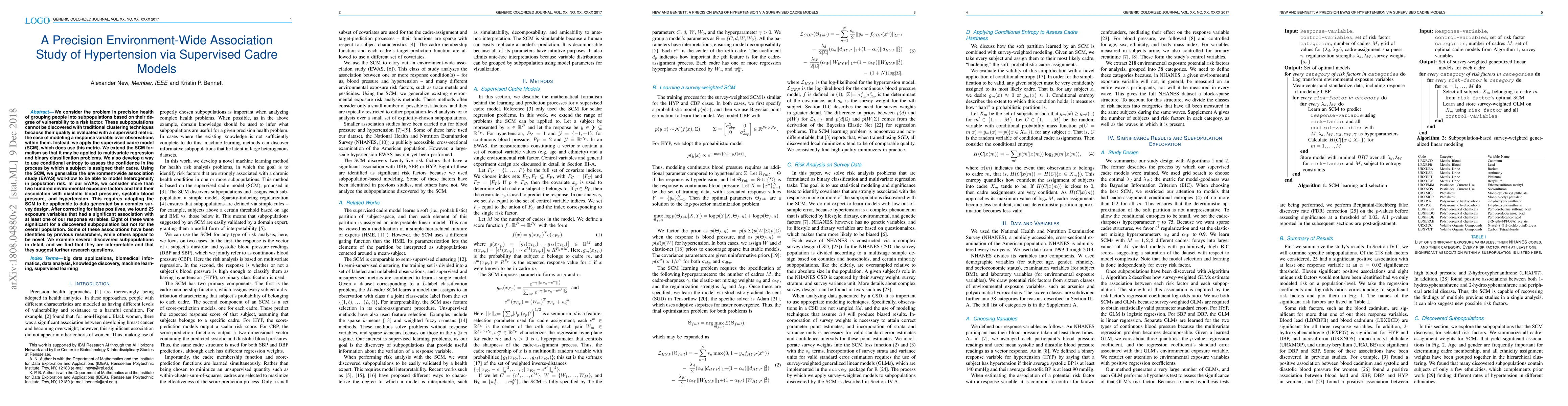 We consider the problem in precision health of grouping people into subpopulations based on their degree of vulnerability to a risk factor. These subpopulations cannot be discovered with traditional clustering techniques because their quality is evaluated with a supervised metric: the ease of modeling a response variable over observations within them. Instead, we apply the supervised cadre model (SCM), which does use this metric. We extend the SCM formalism so that it may be applied to multivariate regression and binary classification problems. We also develop a way to use conditional entropy to assess the confidence in the process by which a subject is assigned their cadre. Using the SCM, we generalize the environment-wide association study (EWAS) workflow to be able to model heterogeneity in population risk. In our EWAS, we consider more than two hundred environmental exposure factors and find their association with diastolic blood pressure, systolic blood pressure, and hypertension. This requires adapting the SCM to be applicable to data generated by a complex survey design. After correcting for false positives, we found 25 exposure variables that had a significant association with at least one of our response variables. Eight of these were significant for a discovered subpopulation but not for the overall population. Some of these associations have been identified by previous researchers, while others appear to be novel. We examine several discovered subpopulations in detail, and we find that they are interpretable and that they suggest further research questions.