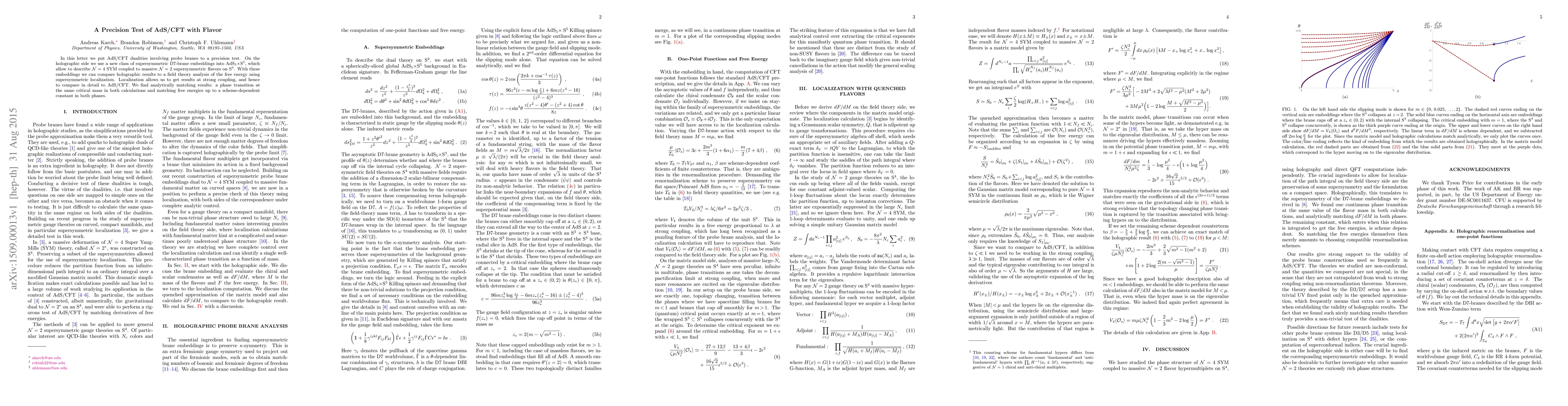 This paper conducts a precise test of AdS/CFT dualities using new supersymmetric D7-brane embeddings in AdS$_5\times$S$^5$ to describe N=4 SYM coupled to massive flavors. It finds matching results between holographic and field theory analyses, including a phase transition at the same critical mass and matching free energies, up to a scheme-dependent constant.