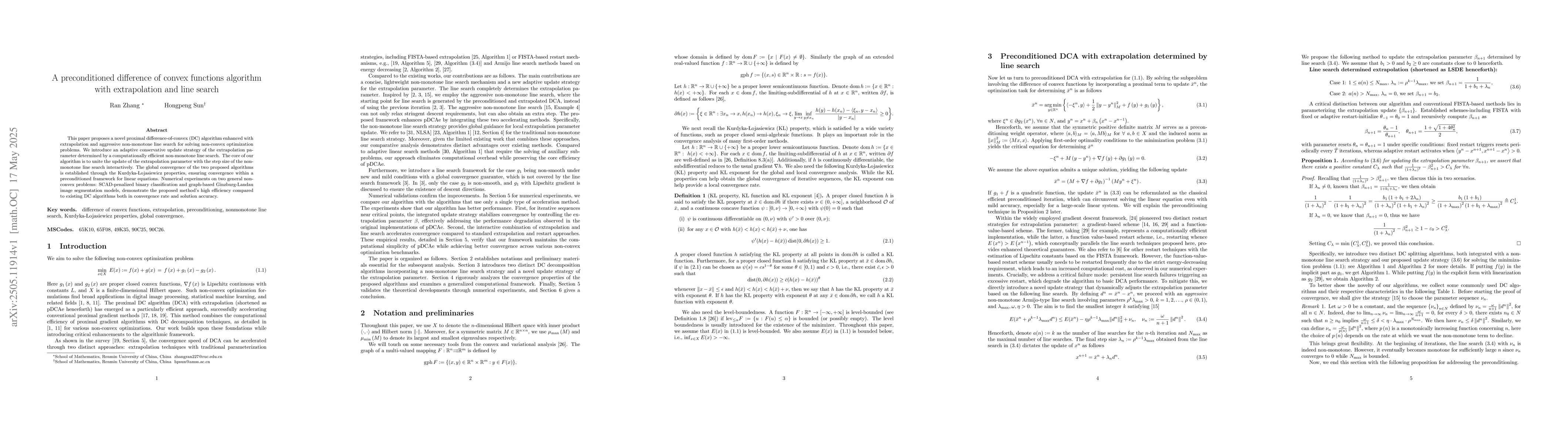 The main technical contribution is the development of a preconditioned difference-of-convex functions algorithm with extrapolation and line search, featuring an adaptive conservative update strategy for the extrapolation parameter and a non-monotone line search.