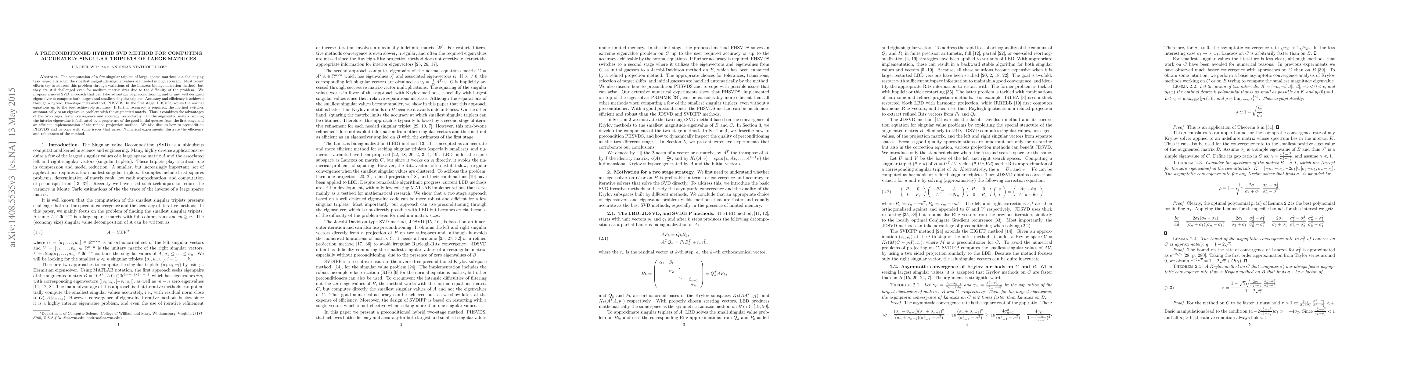 The paper introduces a novel hybrid SVD method, PHSVDS, for accurately computing singular triplets of large, sparse matrices, combining preconditioning and eigensolvers for improved accuracy and efficiency. The method employs a two-stage approach, switching from normal equations to an eigenvalue problem for enhanced precision, and demonstrates efficiency through numerical experiments.