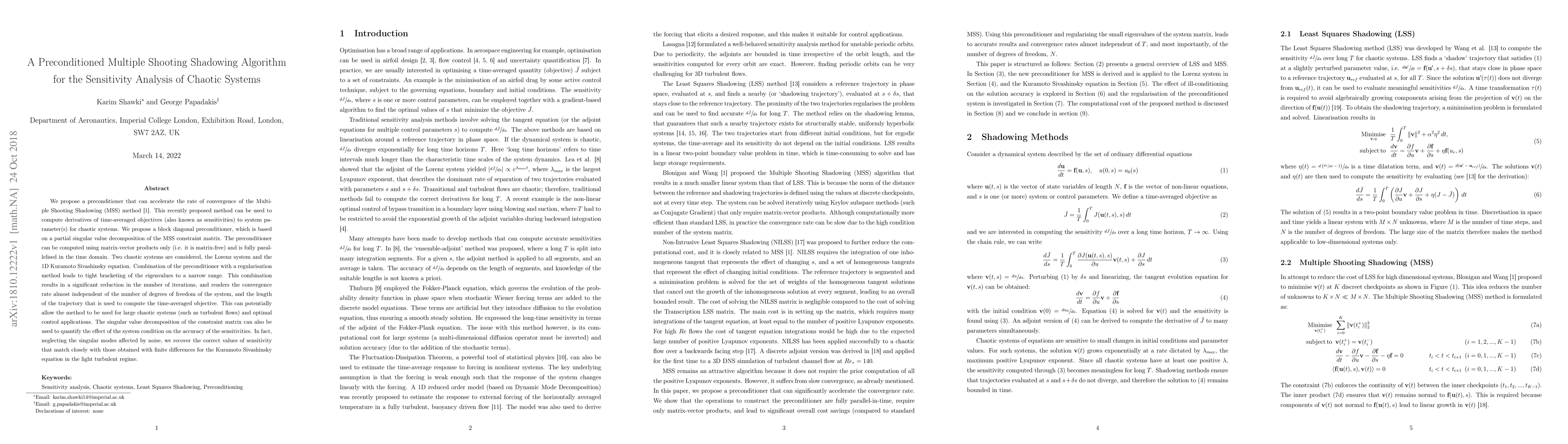 We propose a preconditioner that can accelerate the rate of convergence of the Multiple Shooting Shadowing (MSS) method. This recently proposed method can be used to compute derivatives of time-averaged objectives (also known as sensitivities) to system parameter(s) for chaotic systems. We propose a block diagonal preconditioner, which is based on a partial singular value decomposition of the MSS constraint matrix. The preconditioner can be computed using matrix-vector products only (i.e. it is matrix-free) and is fully parallelised in the time domain. Two chaotic systems are considered, the Lorenz system and the 1D Kuramoto Sivashinsky equation. Combination of the preconditioner with a regularisation method leads to tight bracketing of the eigenvalues to a narrow range. This combination results in a significant reduction in the number of iterations, and renders the convergence rate almost independent of the number of degrees of freedom of the system, and the length of the trajectory that is used to compute the time-averaged objective. This can potentially allow the method to be used for large chaotic systems (such as turbulent flows) and optimal control applications. The singular value decomposition of the constraint matrix can also be used to quantify the effect of the system condition on the accuracy of the sensitivities. In fact, neglecting the singular modes affected by noise, we recover the correct values of sensitivity that match closely with those obtained with finite differences for the Kuramoto Sivashinsky equation in the light turbulent regime.