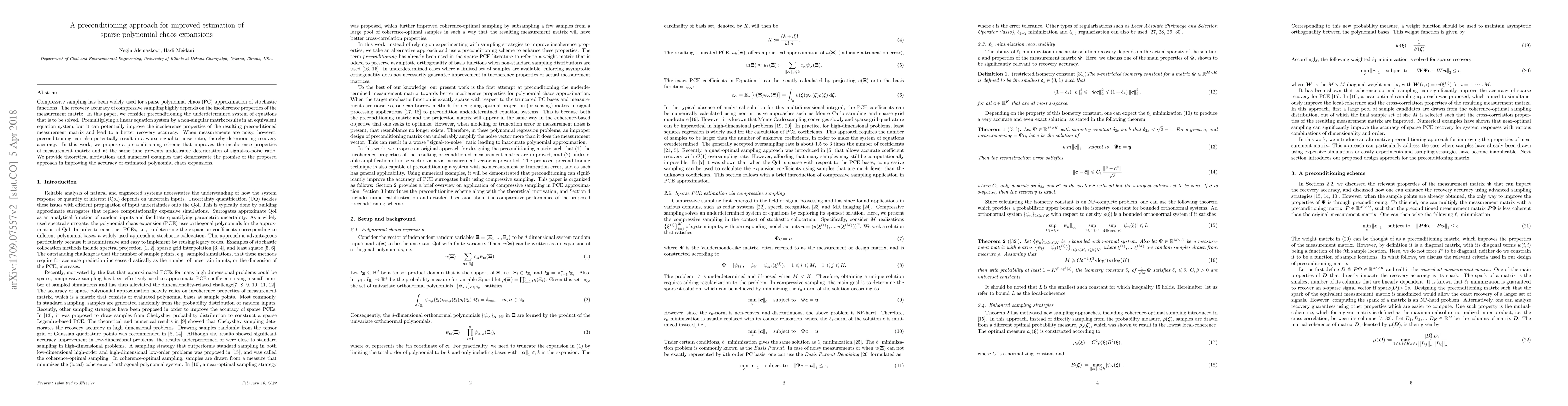 This paper proposes a preconditioning method to enhance the accuracy of sparse polynomial chaos expansions using compressive sampling. The approach aims to improve the incoherence properties of the measurement matrix while mitigating the potential noise amplification, thereby achieving better recovery accuracy.
