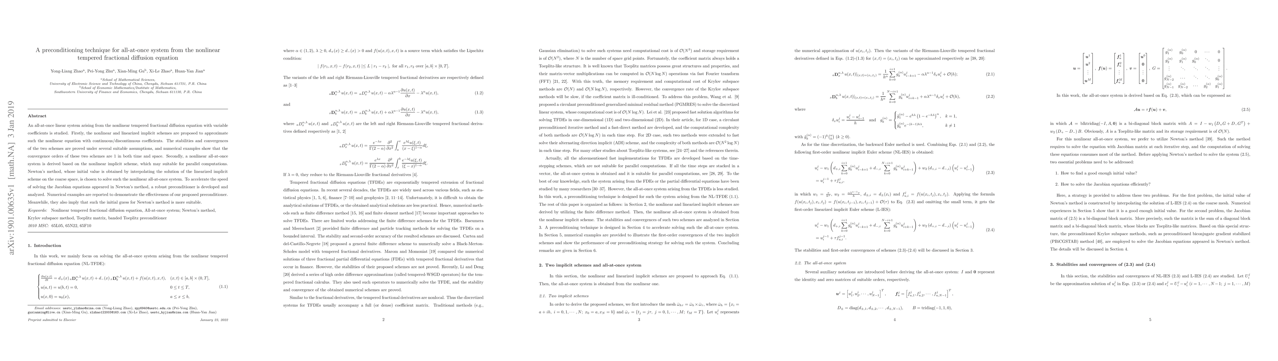This paper proposes a preconditioning technique to solve the nonlinear all-at-once system derived from the nonlinear tempered fractional diffusion equation. It introduces implicit schemes for stability and convergence, and demonstrates the effectiveness of the preconditioner through numerical examples.