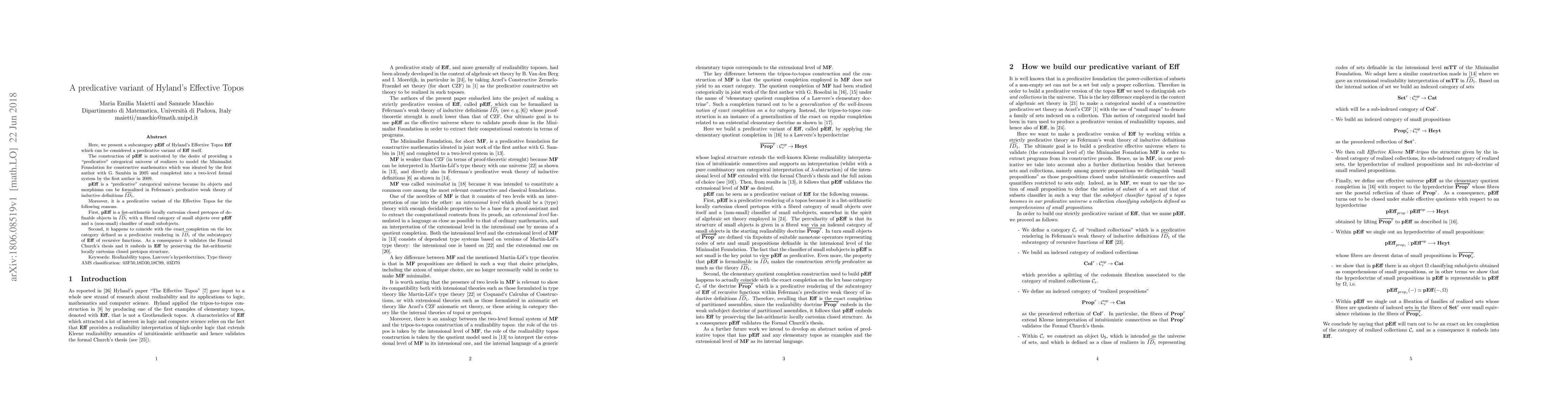 This paper constructs a predicative variant, pEff, of Hyland's Effective Topos Eff, aiming to provide a categorical framework for a Minimalist Foundation of constructive mathematics. pEff respects predicative constraints, aligning with Feferman’s ID1^ theory, and preserves the essential structure of Eff while embedding within it.