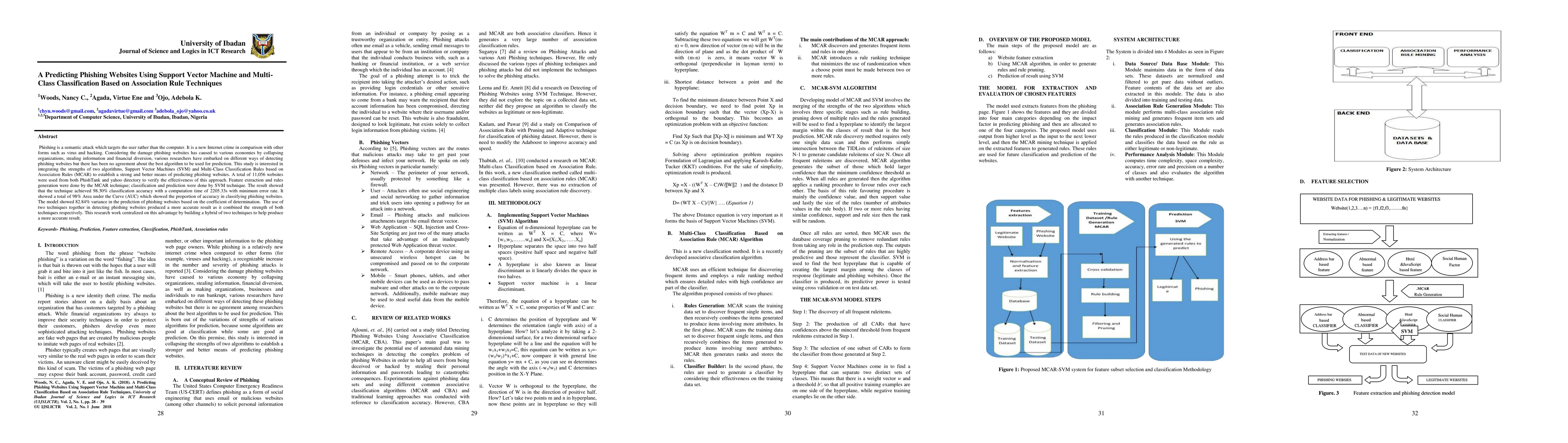 Phishing is a semantic attack which targets the user rather than the computer. It is a new Internet crime in comparison with other forms such as virus and hacking. Considering the damage phishing websites has caused to various economies by collapsing organizations, stealing information and financial diversion, various researchers have embarked on different ways of detecting phishing websites but there has been no agreement about the best algorithm to be used for prediction. This study is interested in integrating the strengths of two algorithms, Support Vector Machines (SVM) and Multi-Class Classification Rules based on Association Rules (MCAR) to establish a strong and better means of predicting phishing websites. A total of 11,056 websites were used from both PhishTank and yahoo directory to verify the effectiveness of this approach. Feature extraction and rules generation were done by the MCAR technique; classification and prediction were done by SVM technique. The result showed that the technique achieved 98.30% classification accuracy with a computation time of 2205.33s with minimum error rate. It showed a total of 98% Area under the Curve (AUC) which showed the proportion of accuracy in classifying phishing websites. The model showed 82.84% variance in the prediction of phishing websites based on the coefficient of determination. The use of two techniques together in detecting phishing websites produced a more accurate result as it combined the strength of both techniques respectively. This research work centralized on this advantage by building a hybrid of two techniques to help produce a more accurate result.