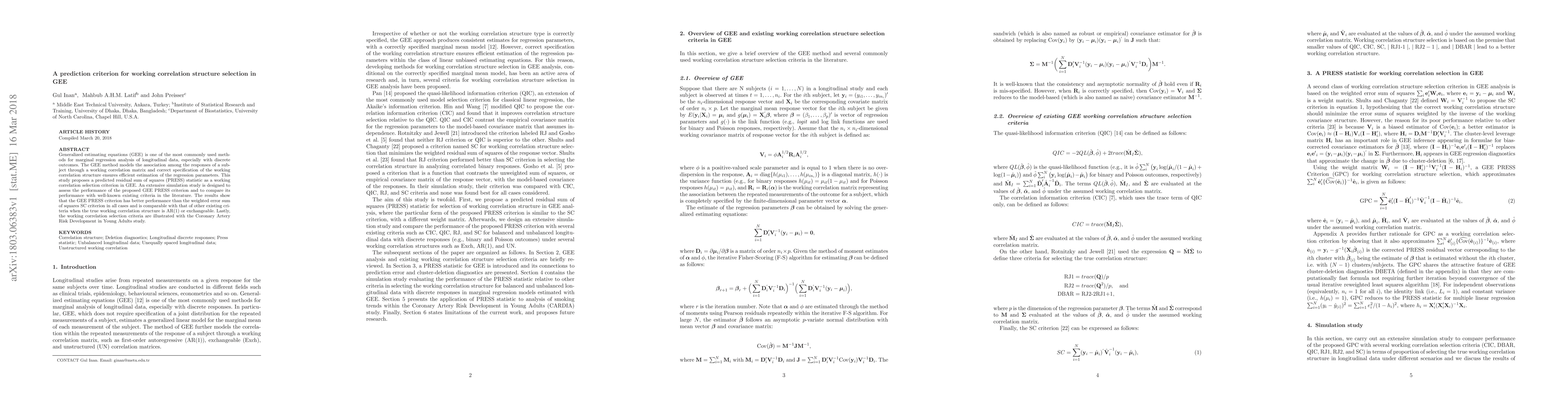 This paper proposes a new predicted residual sum of squares (PRESS) statistic for selecting the working correlation structure in GEE analysis for longitudinal data. Simulation results indicate that the GEE PRESS criterion outperforms the weighted error sum of squares SC criterion and is competitive with other existing criteria, especially when the true correlation structure is AR(1) or exchangeable.
