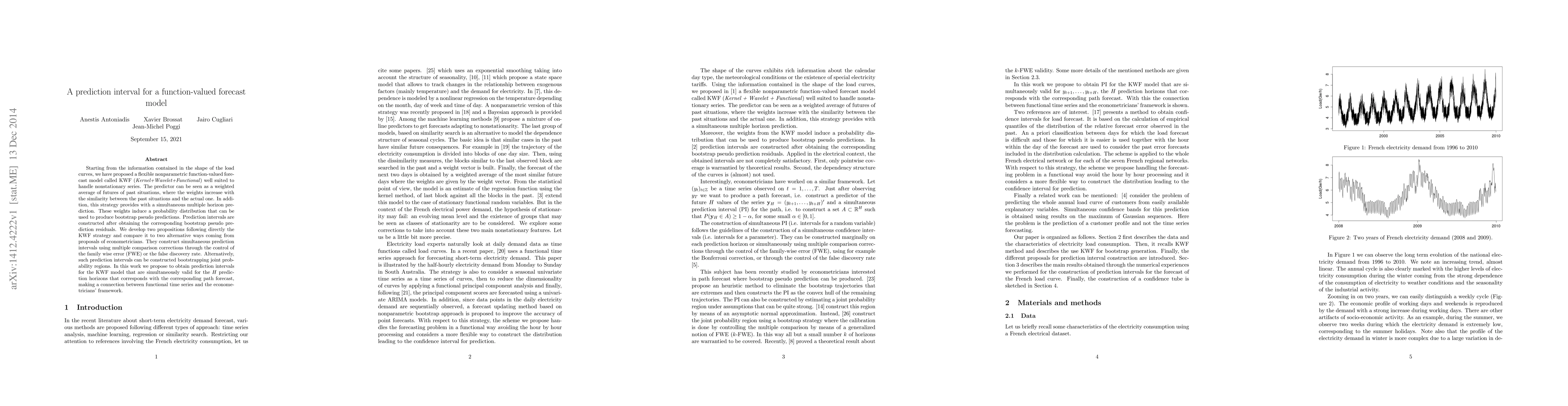 Starting from the information contained in the shape of the load curves, we have proposed a flexible nonparametric function-valued fore-cast model called KWF (Kernel+Wavelet+Functional) well suited to handle nonstationary series. The predictor can be seen as a weighted average of futures of past situations, where the weights increase with the similarity between the past situations and the actual one. In addi-tion, this strategy provides with a simultaneous multiple horizon pre-diction. These weights induce a probability distribution that can be used to produce bootstrap pseudo predictions. Prediction intervals are constructed after obtaining the corresponding bootstrap pseudo pre-diction residuals. We develop two propositions following directly the KWF strategy and compare it to two alternative ways coming from proposals of econometricians. They construct simultaneous prediction intervals using multiple comparison corrections through the control of the family wise error (FWE) or the false discovery rate. Alternatively, such prediction intervals can be constructed bootstrapping joint prob-ability regions. In this work we propose to obtain prediction intervals for the KWF model that are simultaneously valid for the H predic-tion horizons that corresponds with the corresponding path forecast, making a connection between functional time series and the econome-tricians' framework.