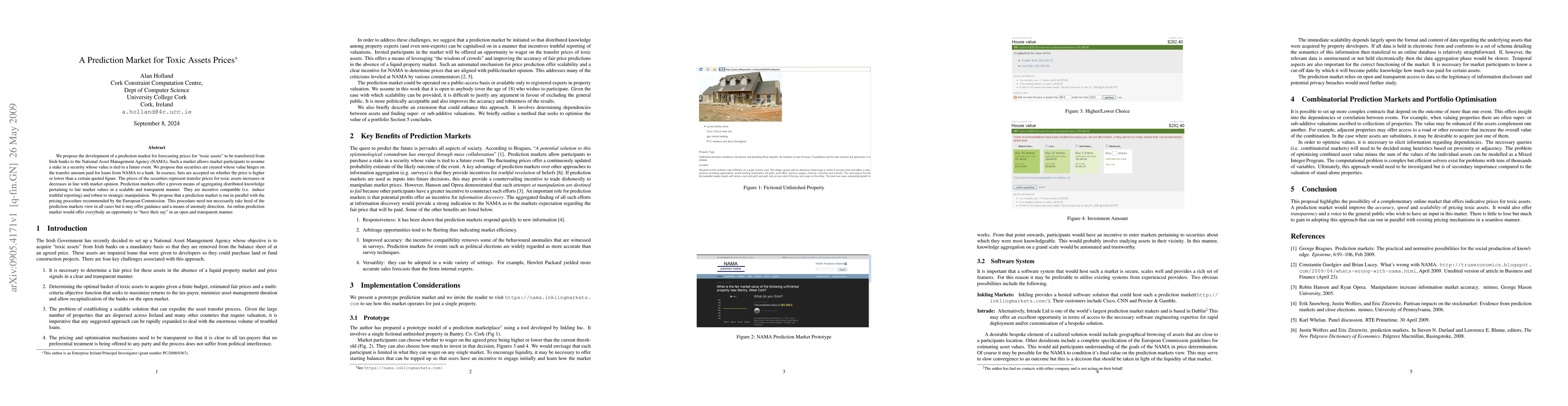 A prediction market is proposed to forecast prices of toxic assets transferred from Irish banks to NAMA, leveraging distributed knowledge and incentivizing truthful reporting.
