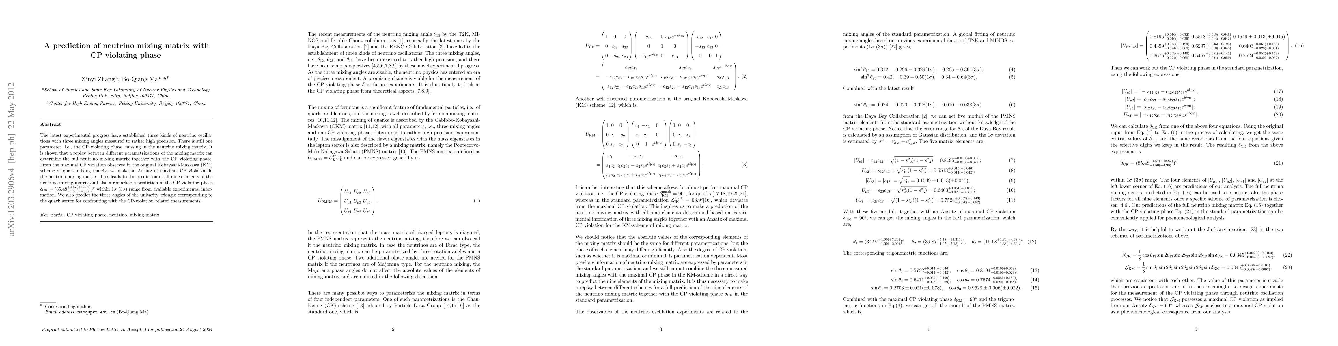 This paper predicts the complete neutrino mixing matrix, including the CP violating phase, using maximal CP violation assumptions based on the Kobayashi-Maskawa scheme. It forecasts the CP violating phase $\delta_{\rm CK}$ and the three angles of the unitarity triangle for comparison with experimental data.