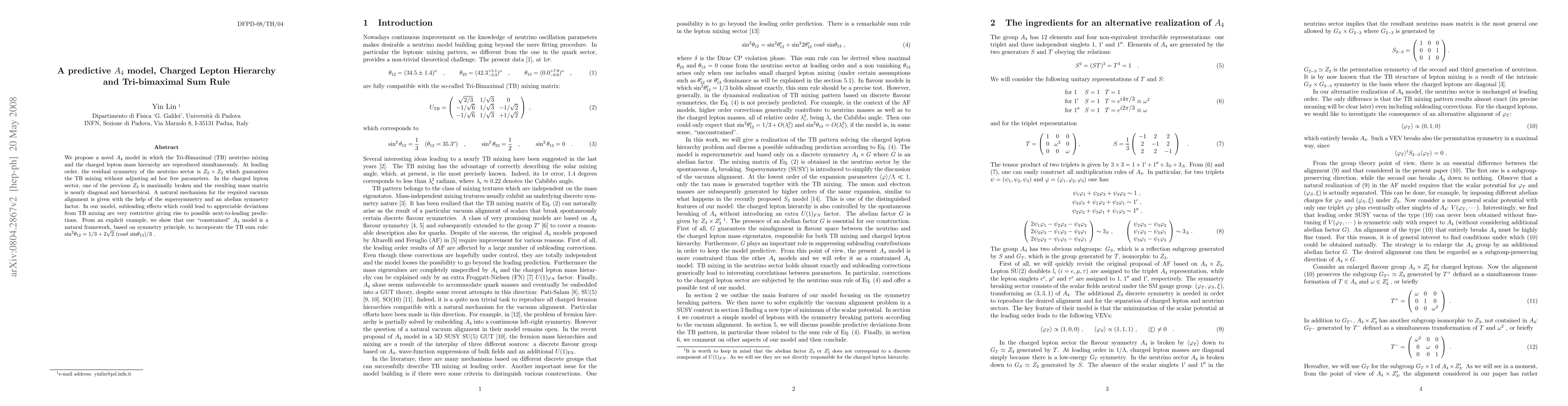 We propose a novel A4 model in which the Tri-Bimaximal (TB) neutrino mixing and the charged lepton mass hierarchy are reproduced simultaneously. At leading order, the residual symmetry of the neutrino sector is Z2 x Z2 which guarantees the TB mixing without adjusting ad hoc free parameters. In the charged lepton sector, one of the previous Z2 is maximally broken and the resulting mass matrix is nearly diagonal and hierarchical. A natural mechanism for the required vacuum alignment is given with the help of the supersymmetry and an abelian symmetry factor. In our model, subleading effects which could lead to appreciable deviations from TB mixing are very restrictive giving rise to possible next-to-leading predictions. From an explicit example, we show that our ``constrained'' A4 model is a natural framework, based on symmetry principle, to incorporate the TB sum rule: sin^2(\theta_{12})=1/3+2\sqrt{2}(cos(\delta) sin(\theta_{13})/3).