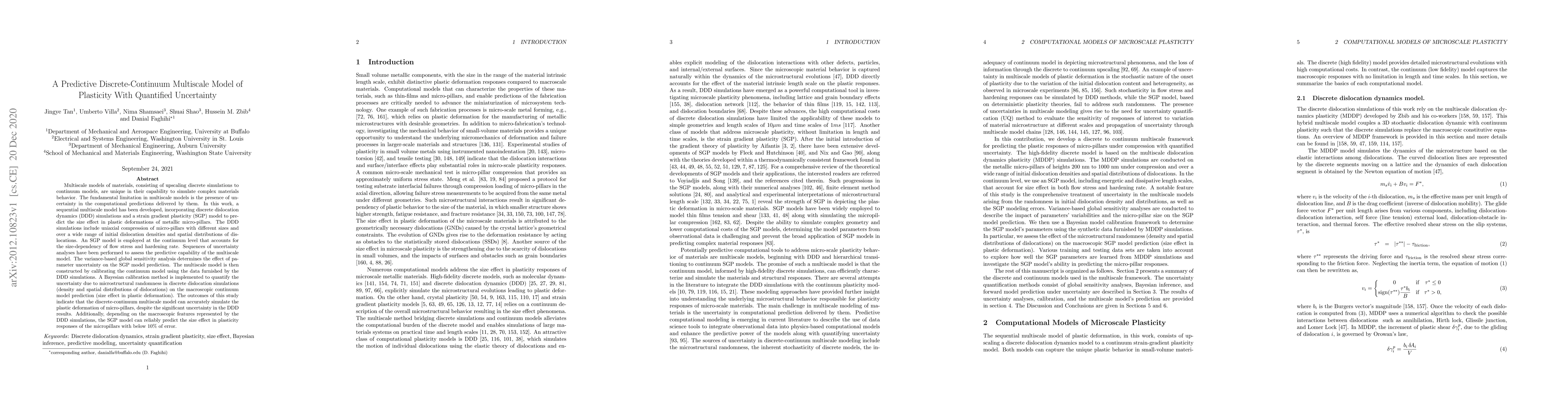 This research develops a predictive multiscale model combining discrete dislocation dynamics and strain gradient plasticity to simulate the plastic deformation of metallic micro-pillars. The model quantifies uncertainty through Bayesian calibration and sensitivity analysis, demonstrating accurate predictions of size effects in plastic deformation despite significant microstructural randomness.