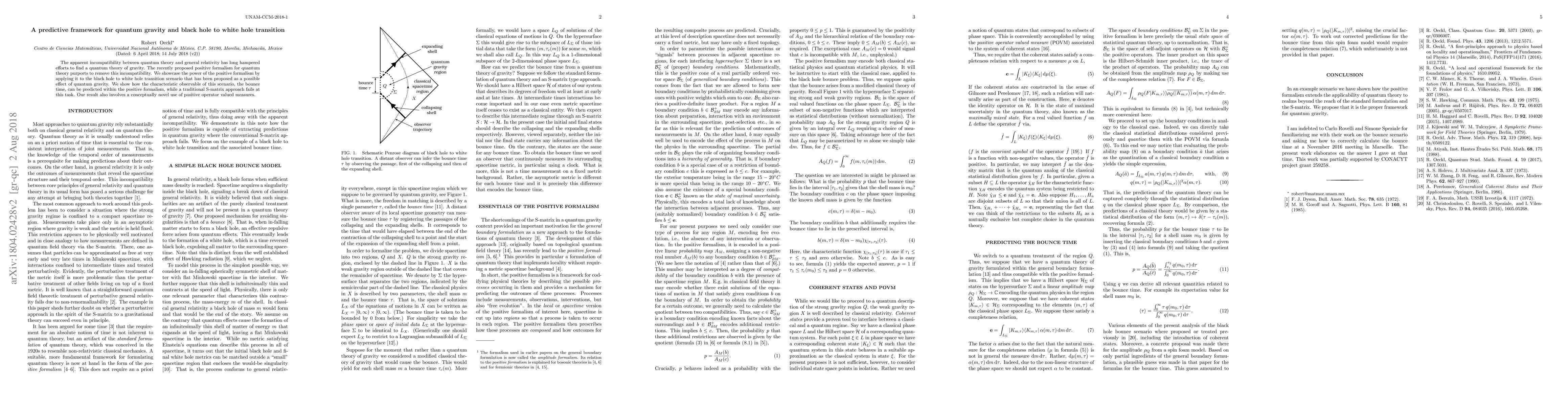 The apparent incompatibility between quantum theory and general relativity has long hampered efforts to find a quantum theory of gravity. The recently proposed positive formalism for quantum theory purports to remove this incompatibility. We showcase the power of the positive formalism by applying it to the black hole to white hole transition scenario that has been proposed as a possible effect of quantum gravity. We show how the characteristic observable of this scenario, the bounce time, can be predicted within the positive formalism, while a traditional S-matrix approach fails at this task. Our result also involves a conceptually novel use of positive operator valued measures.