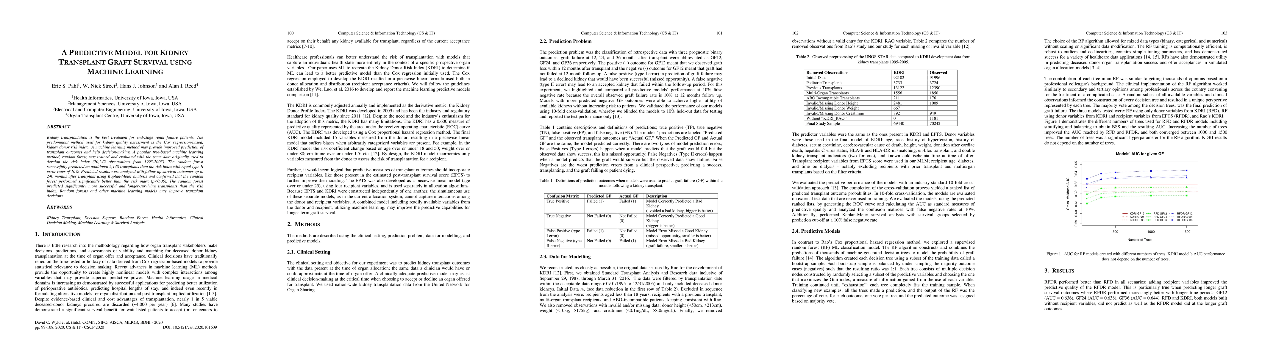 This study developed a predictive model using random forest machine learning to enhance graft survival prediction in kidney transplants, outperforming the traditional Cox regression-based kidney donor risk index. The model identified more successful transplants with significantly better survival outcomes compared to the existing risk index.