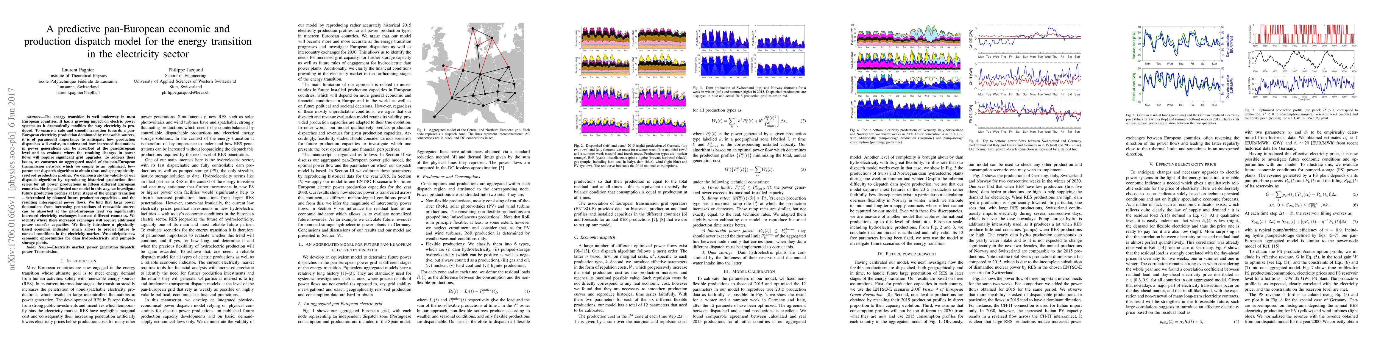 The energy transition is well underway in most European countries. It has a growing impact on electric power systems as it dramatically modifies the way electricity is produced. To ensure a safe and smooth transition towards a pan-European electricity production dominated by renewable sources, it is of paramount importance to anticipate how production dispatches will evolve, to understand how increased fluctuations in power generations can be absorbed at the pan-European level and to evaluate where the resulting changes in power flows will require significant grid upgrades. To address these issues, we construct an aggregated model of the pan-European transmission network which we couple to an optimized, few-parameter dispatch algorithm to obtain time- and geographically-resolved production profiles. We demonstrate the validity of our dispatch algorithm by reproducing historical production time series for all power productions in fifteen different European countries. Having calibrated our model in this way, we investigate future production profiles at later stages of the energy transition - determined by planned future production capacities - and the resulting interregional power flows. We find that large power fluctuations from increasing penetrations of renewable sources can be absorbed at the pan-European level via significantly increased electricity exchanges between different countries. We identify where these increased exchanges will require additional power transfer capacities. We finally introduce a physically-based economic indicator which allows to predict future financial conditions in the electricity market. We anticipate new economic opportunities for dam hydroelectricity and pumped-storage plants.