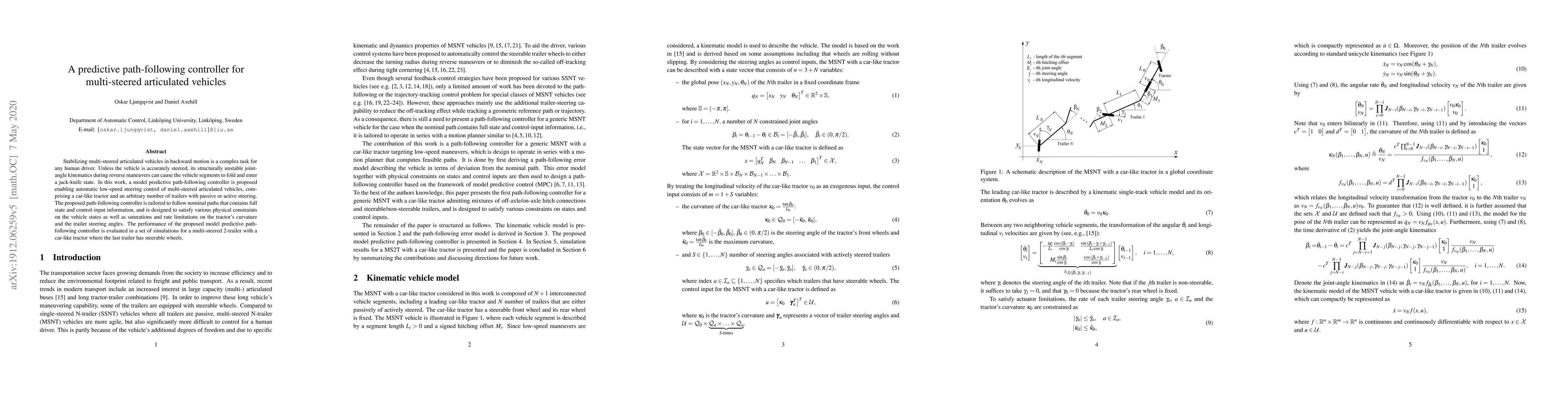 This paper proposes a model predictive path-following controller for stabilizing multi-steered articulated vehicles during backward maneuvers, addressing the risk of jack-knifing. The controller is designed to handle various physical constraints and control limitations, demonstrated through simulations on a 2-trailer setup.