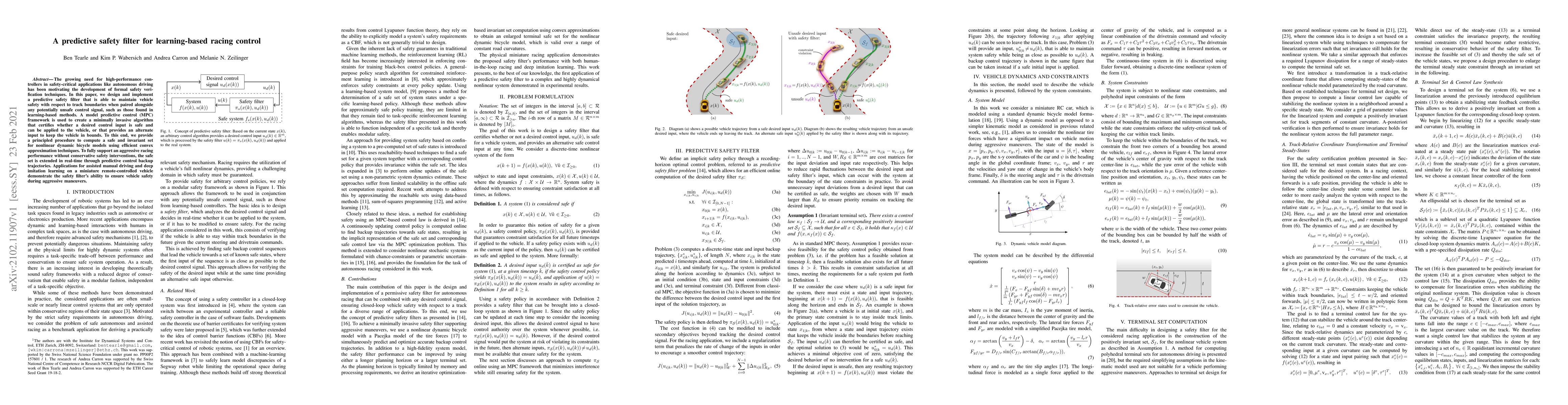 This paper introduces a predictive safety filter using model predictive control to ensure vehicle safety in racing applications, even when paired with potentially unsafe control signals from learning-based methods. The filter dynamically computes safe and invariant sets for nonlinear models, providing real-time adjustments to maintain track boundaries.