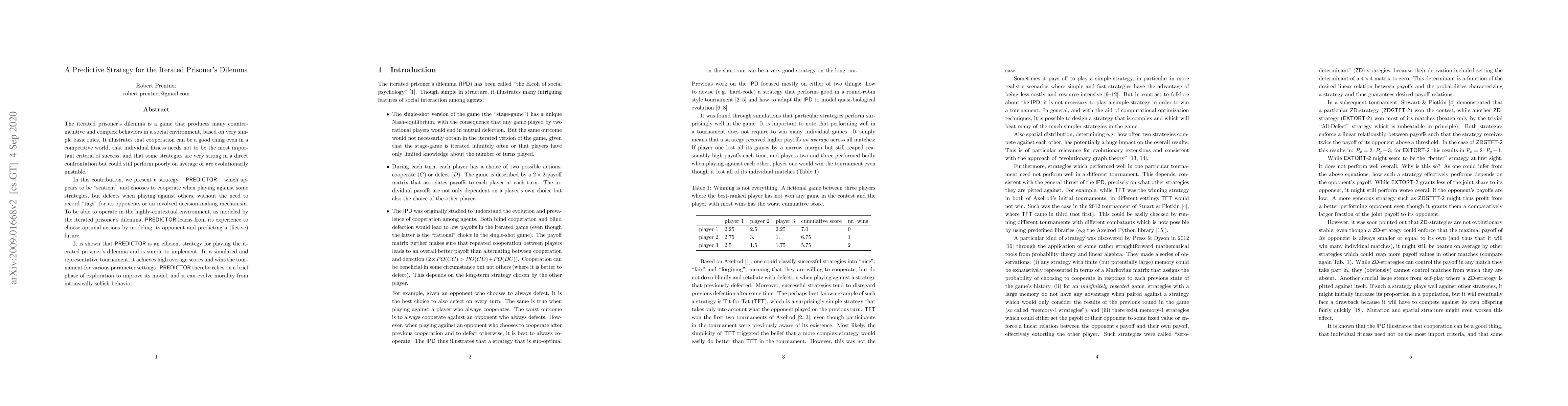 This paper introduces PREDICTOR, a predictive strategy for the iterated prisoner's dilemma that adapts its behavior based on learning from experience without tagging opponents. It achieves high performance in tournaments by modeling opponents and predicting future interactions, demonstrating that cooperation can emerge from inherently selfish behavior.