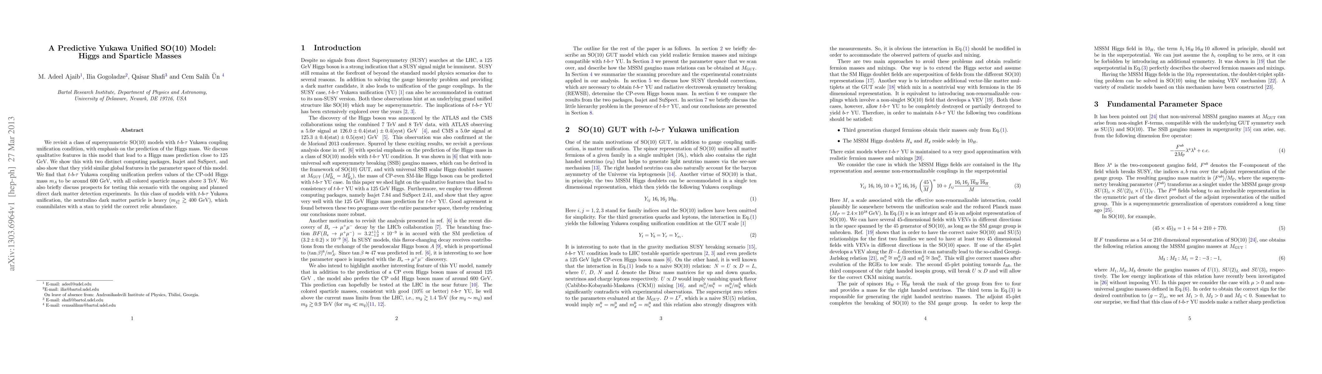 This research revisits supersymmetric SO(10) models with t-b-tau Yukawa unification to predict a Higgs mass near 125 GeV, showing consistent results using Isajet and SuSpect. The model favors CP-odd Higgs mass values around 600 GeV and high colored sparticle masses above 3 TeV, with heavy neutralino dark matter that aids in achieving the correct relic abundance through coannihilation with staus.