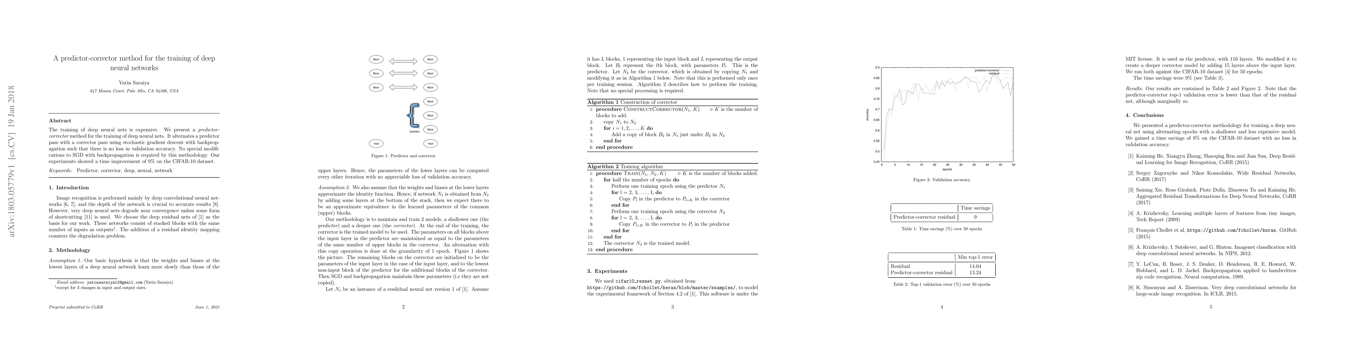 This paper introduces a predictor-corrector method for training deep neural networks, alternating predictor and corrector passes with stochastic gradient descent to improve training efficiency without sacrificing validation accuracy. Experiments demonstrated a 9% time improvement on the CIFAR-10 dataset.