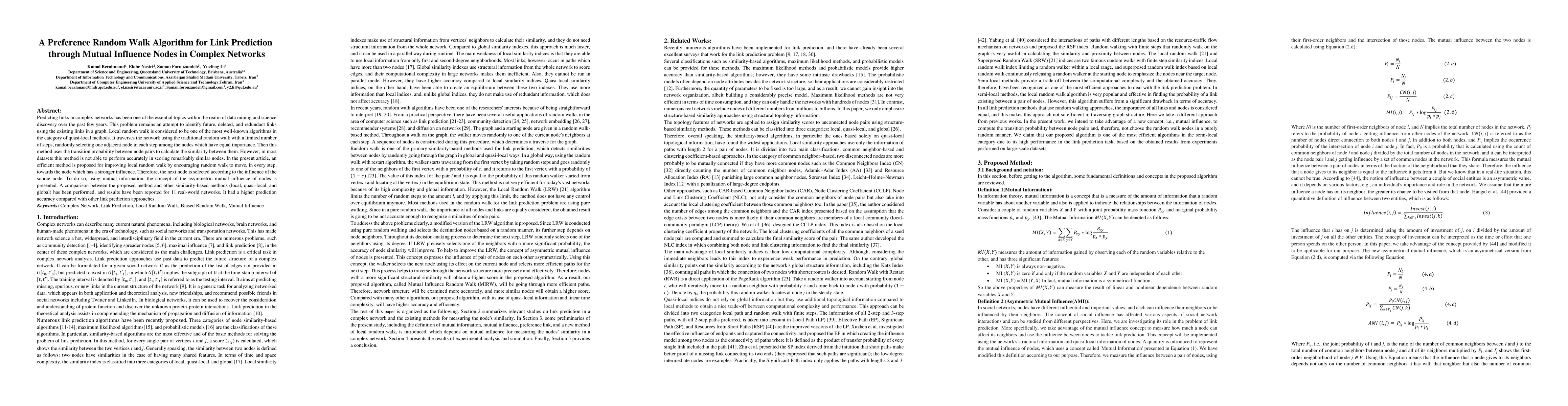 This paper proposes a preference random walk algorithm that enhances local random walk by prioritizing nodes based on mutual influence, using mutual information to improve link prediction accuracy. Comparative results on 11 real-world networks show superior performance over other similarity-based methods.