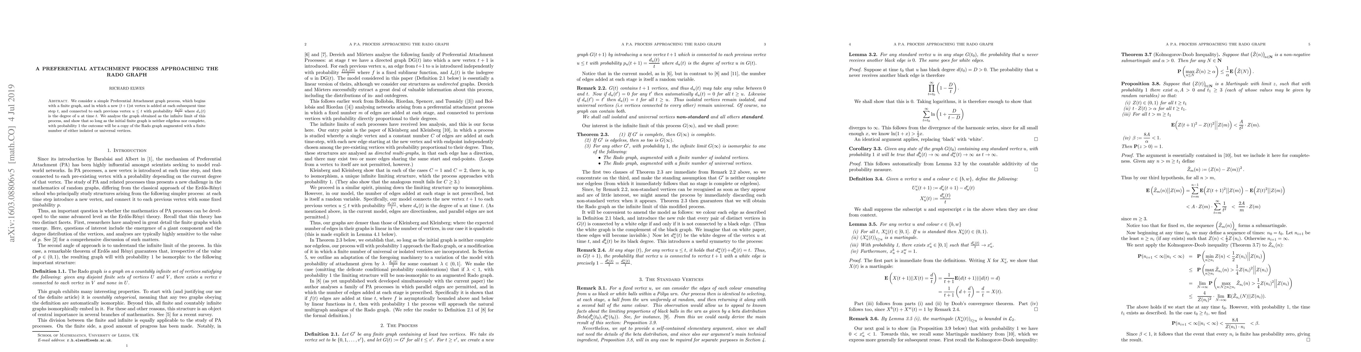 This paper studies a Preferential Attachment graph process that evolves by adding a new vertex at each time step and connecting it to previous vertices based on their degrees. The authors demonstrate that, under certain conditions, the infinite limit of this process resembles a copy of the Rado graph with some isolated or universal vertices.