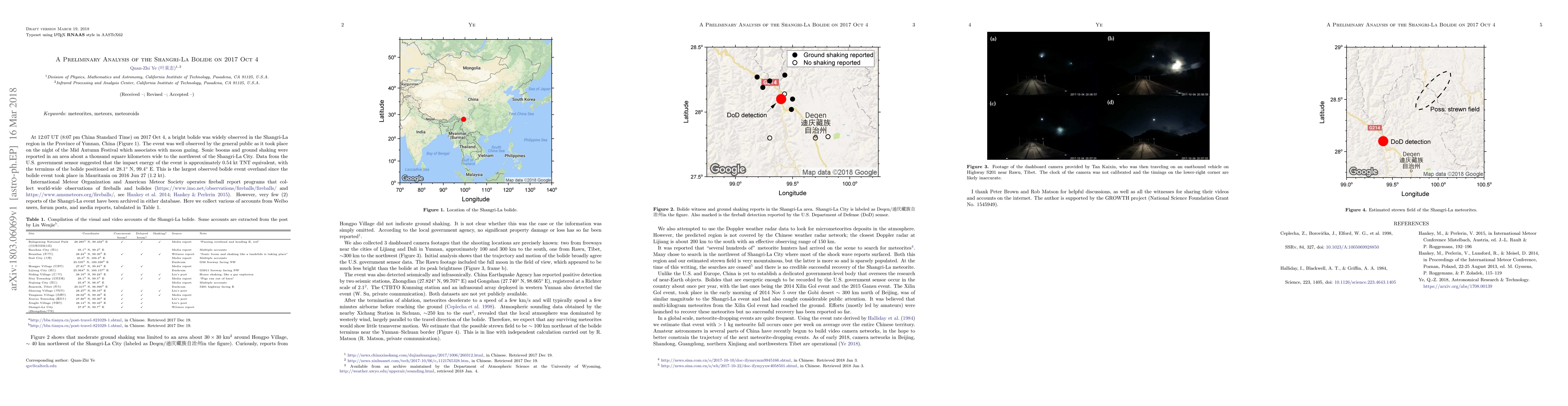 A bright bolide was observed in China's Shangri-La region on October 4, 2017, causing sonic booms and ground shaking, with estimated impact energy of 0.54 kt TNT equivalent.