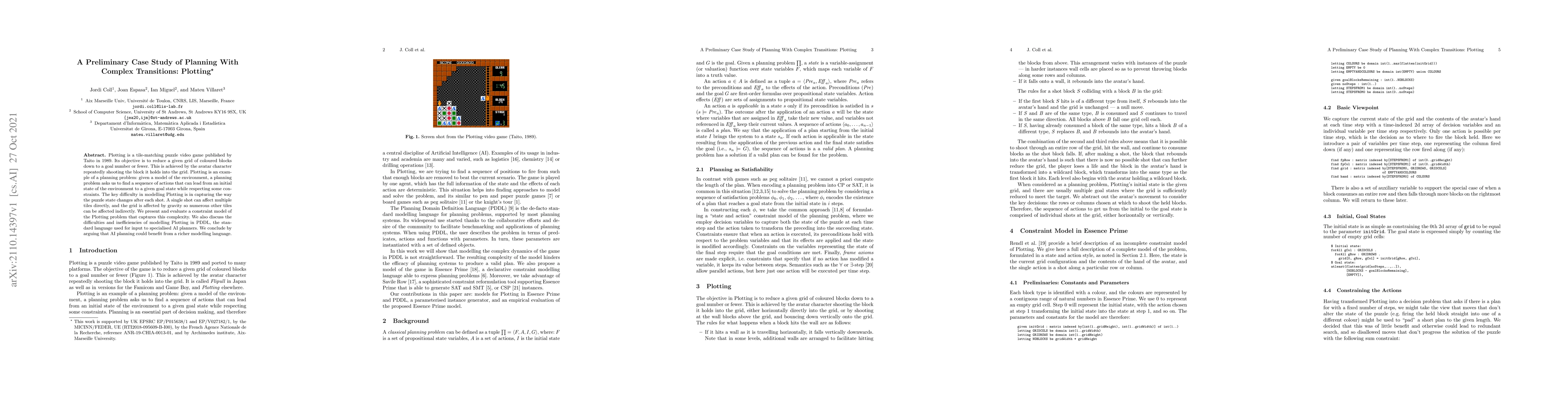 Plotting is a tile-matching puzzle video game published by Taito in 1989. Its objective is to reduce a given grid of coloured blocks down to a goal number or fewer. This is achieved by the avatar character repeatedly shooting the block it holds into the grid. Plotting is an example of a planning problem: given a model of the environment, a planning problem asks us to find a sequence of actions that can lead from an initial state of the environment to a given goal state while respecting some constraints. The key difficulty in modelling Plotting is in capturing the way the puzzle state changes after each shot. A single shot can affect multiple tiles directly, and the grid is affected by gravity so numerous other tiles can be affected indirectly. We present and evaluate a constraint model of the Plotting problem that captures this complexity. We also discuss the difficulties and inefficiencies of modelling Plotting in PDDL, the standard language used for input to specialised AI planners. We conclude by arguing that AI planning could benefit from a richer modelling language.