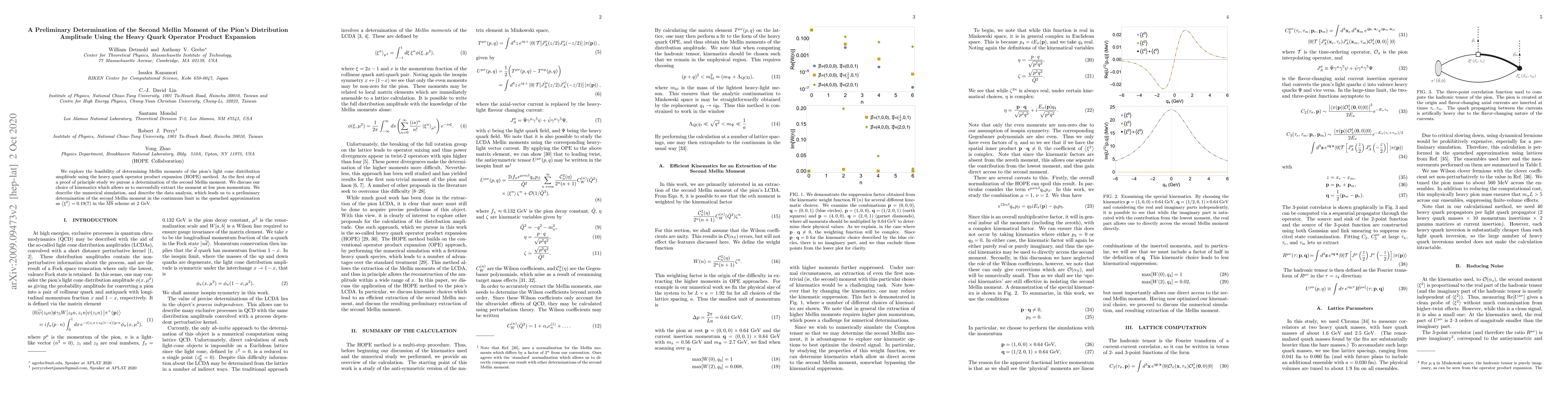 Researchers used the heavy quark operator product expansion to calculate the second Mellin moment of the pion's distribution amplitude, finding a preliminary value of 0.19(7) in the $ar{ ext{MS}}$ scheme at 2 GeV.