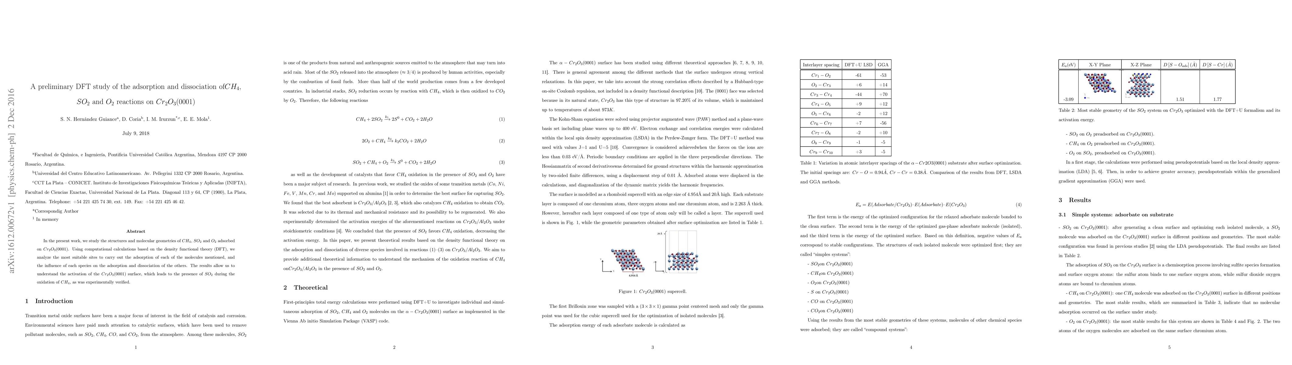 In the present work, we study the structures and molecular geometries of $CH_{4}$, $SO_{2}$ and $O_{2}$ adsorbed on $Cr_{2}O_{3}(0001)$. Using computational calculations based on the density functional theory (DFT), we analyze the most suitable sites to carry out the adsorption of each of the molecules mentioned, and the influence of each species on the adsorption and dissociation of the others. The results allow us to understand the activation of the $Cr_{2}O_{3}(0001)$ surface, which leads to the presence of $SO_{2}$ during the oxidation of $CH_{4}$, as was experimentally verified.