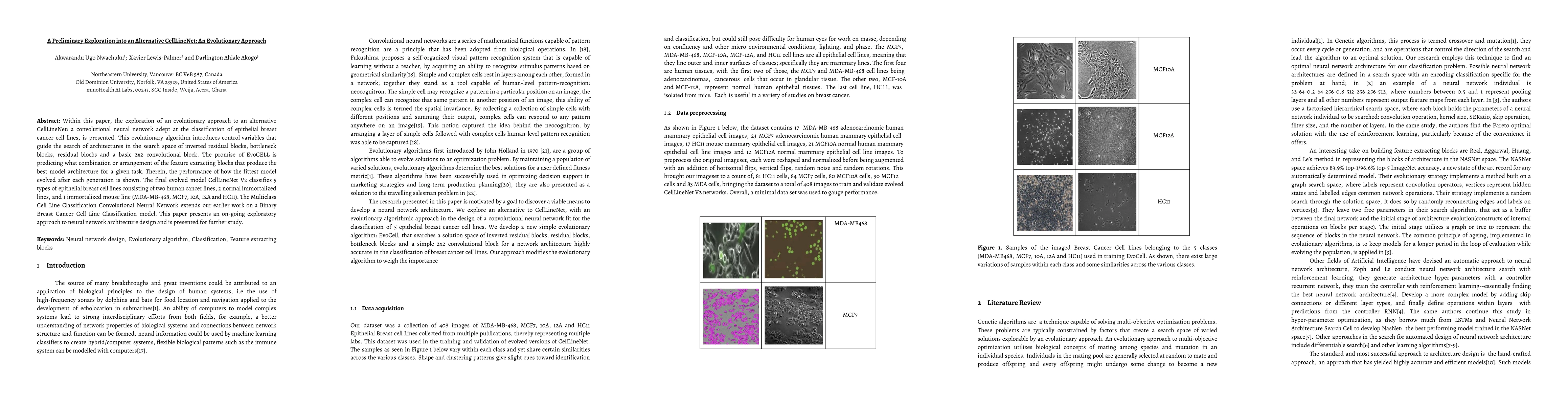 Within this paper, the exploration of an evolutionary approach to an alternative CellLineNet: a convolutional neural network adept at the classification of epithelial breast cancer cell lines, is presented. This evolutionary algorithm introduces control variables that guide the search of architectures in the search space of inverted residual blocks, bottleneck blocks, residual blocks and a basic 2x2 convolutional block. The promise of EvoCELL is predicting what combination or arrangement of the feature extracting blocks that produce the best model architecture for a given task. Therein, the performance of how the fittest model evolved after each generation is shown. The final evolved model CellLineNet V2 classifies 5 types of epithelial breast cell lines consisting of two human cancer lines, 2 normal immortalized lines, and 1 immortalized mouse line (MDA-MB-468, MCF7, 10A, 12A and HC11). The Multiclass Cell Line Classification Convolutional Neural Network extends our earlier work on a Binary Breast Cancer Cell Line Classification model. This paper presents an on-going exploratory approach to neural network architecture design and is presented for further study.