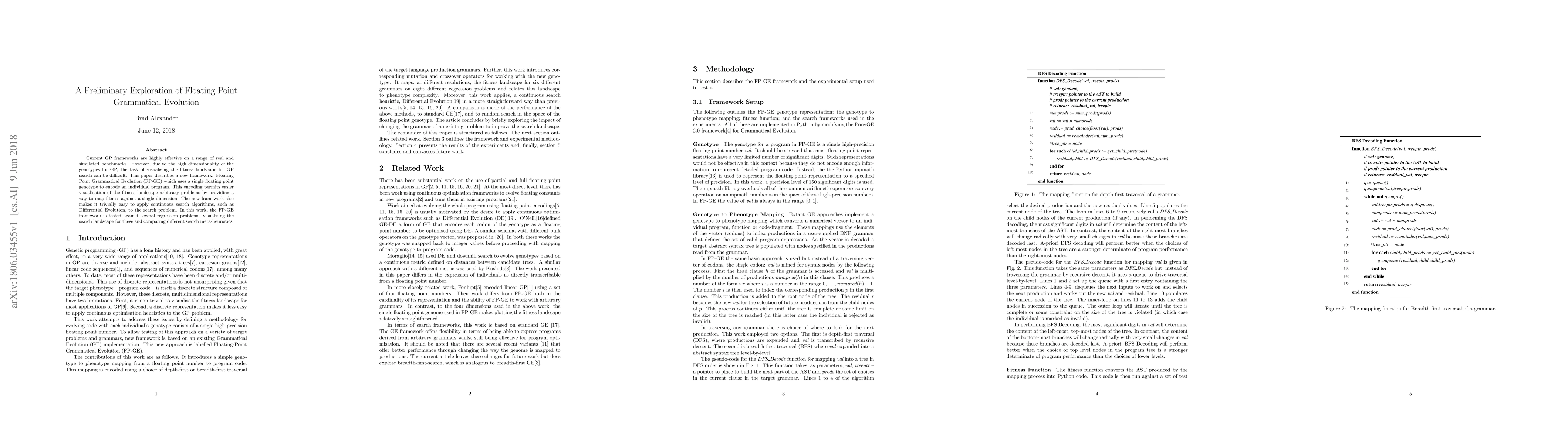 Current GP frameworks are highly effective on a range of real and simulated benchmarks. However, due to the high dimensionality of the genotypes for GP, the task of visualising the fitness landscape for GP search can be difficult. This paper describes a new framework: Floating Point Grammatical Evolution (FP-GE) which uses a single floating point genotype to encode an individual program. This encoding permits easier visualisation of the fitness landscape arbitrary problems by providing a way to map fitness against a single dimension. The new framework also makes it trivially easy to apply continuous search algorithms, such as Differential Evolution, to the search problem. In this work, the FP-GE framework is tested against several regression problems, visualising the search landscape for these and comparing different search meta-heuristics.