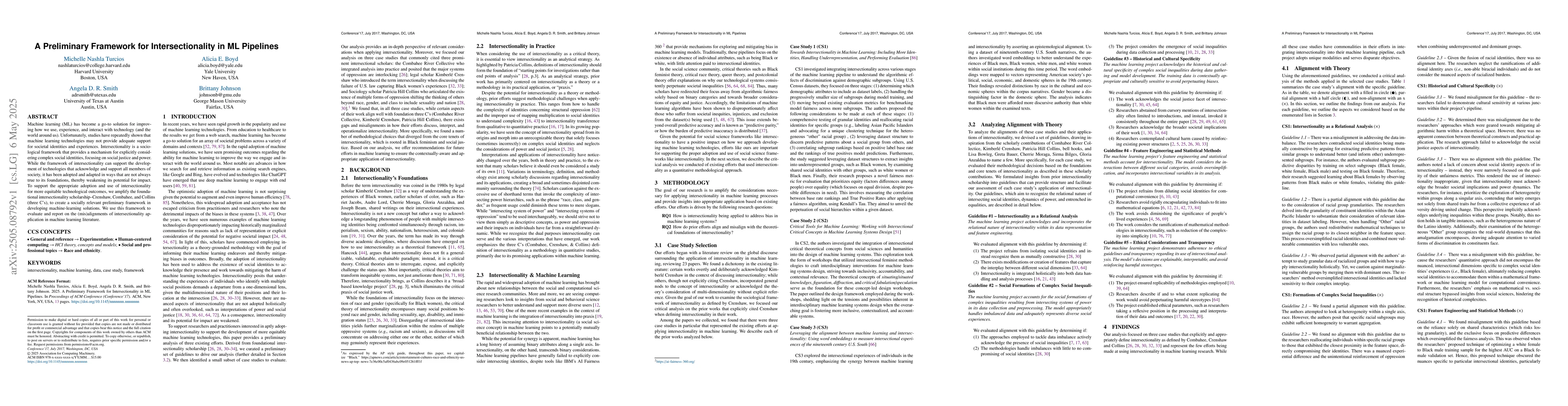 The paper amplifies foundational intersectionality scholarship from Crenshaw, Combahee, and Collins to create a socially relevant preliminary framework for developing machine-learning solutions, evaluating and reporting on intersectionality application misalignments in ML literature.