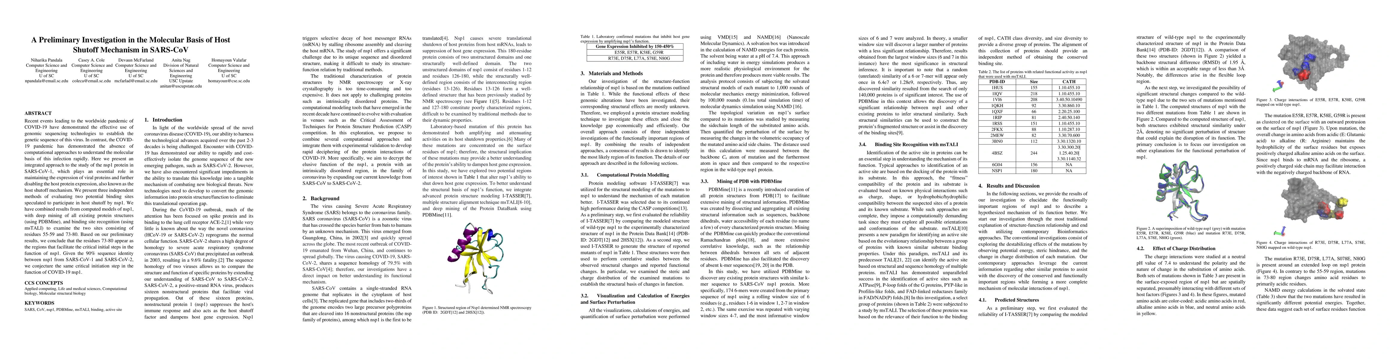 Recent events leading to the worldwide pandemic of COVID-19 have demonstrated the effective use of genomic sequencing technologies to establish the genetic sequence of this virus. In contrast, the COVID-19 pandemic has demonstrated the absence of computational approaches to understand the molecular basis of this infection rapidly. Here we present an integrated approach to the study of the nsp1 protein in SARS-CoV-1, which plays an essential role in maintaining the expression of viral proteins and further disabling the host protein expression, also known as the host shutoff mechanism. We present three independent methods of evaluating two potential binding sites speculated to participate in host shutoff by nsp1. We have combined results from computed models of nsp1, with deep mining of all existing protein structures (using PDBMine), and binding site recognition (using msTALI) to examine the two sites consisting of residues 55-59 and 73-80. Based on our preliminary results, we conclude that the residues 73-80 appear as the regions that facilitate the critical initial steps in the function of nsp1. Given the 90% sequence identity between nsp1 from SARS-CoV-1 and SARS-CoV-2, we conjecture the same critical initiation step in the function of COVID-19 nsp1.