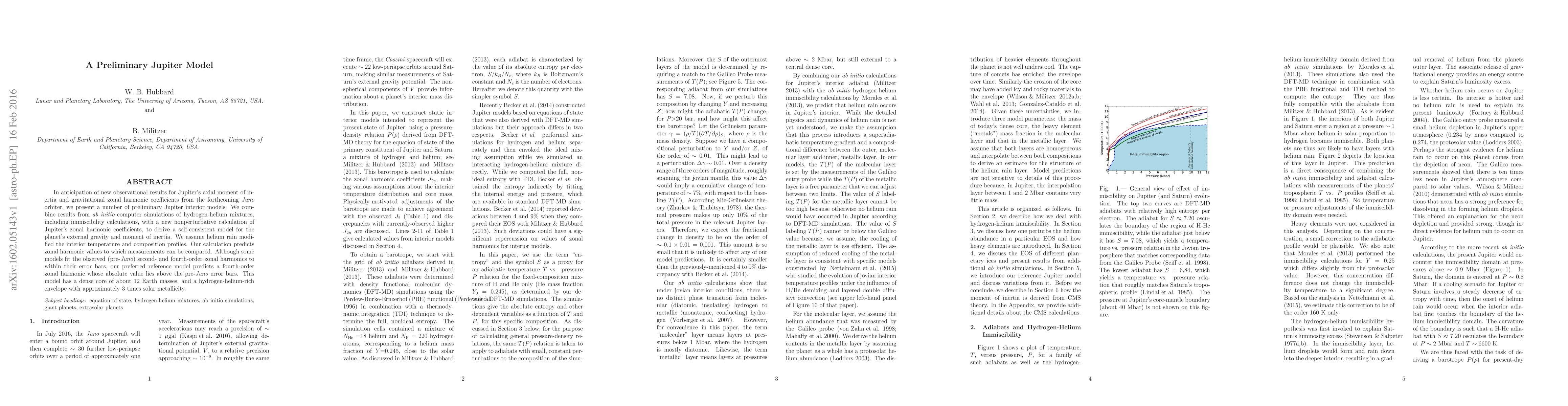 In anticipation of new observational results for Jupiter's axial moment of inertia and gravitational zonal harmonic coefficients from the forthcoming Juno orbiter, we present a number of preliminary Jupiter interior models. We combine results from ab initio computer simulations of hydrogen-helium mixtures, including immiscibility calculations, with a new nonperturbative calculation of Jupiter's zonal harmonic coefficients, to derive a self-consistent model for the planet's external gravity and moment of inertia. We assume helium rain modified the interior temperature and composition profiles. Our calculation predicts zonal harmonic values to which measurements can be compared. Although some models fit the observed (pre-Juno) second- and fourth-order zonal harmonics to within their error bars, our preferred reference model predicts a fourth-order zonal harmonic whose absolute value lies above the pre-Juno error bars. This model has a dense core of about 12 Earth masses, and a hydrogen-helium-rich envelope with approximately 3 times solar metallicity.