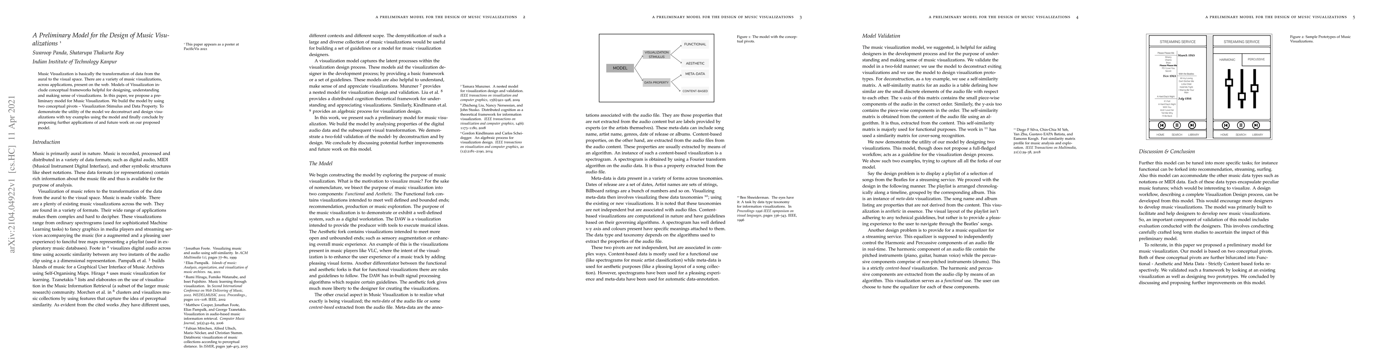 This paper proposes a preliminary model for Music Visualization, using two conceptual pivots: Visualization Stimulus and Data Property. The model is demonstrated through deconstruction and redesign of toy examples, with plans for further applications and future work outlined.