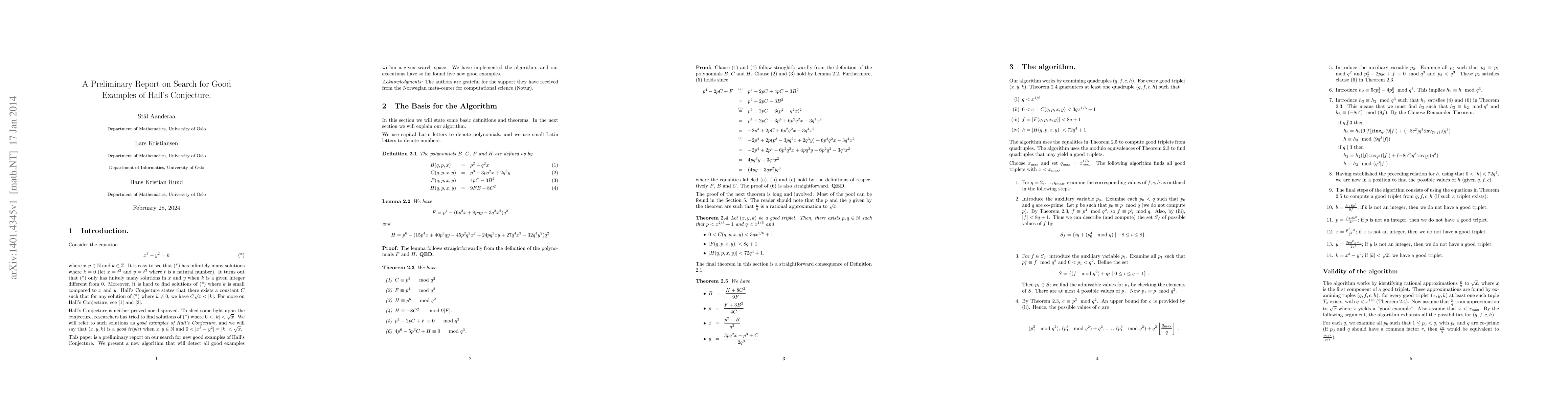This paper is a preliminary report on our search for new good examples of Hall's Conjecture. We present a new algorithm that will detect all good examples within a given search space. We have implemented the algorithm, and our executions have so far found five new good examples.