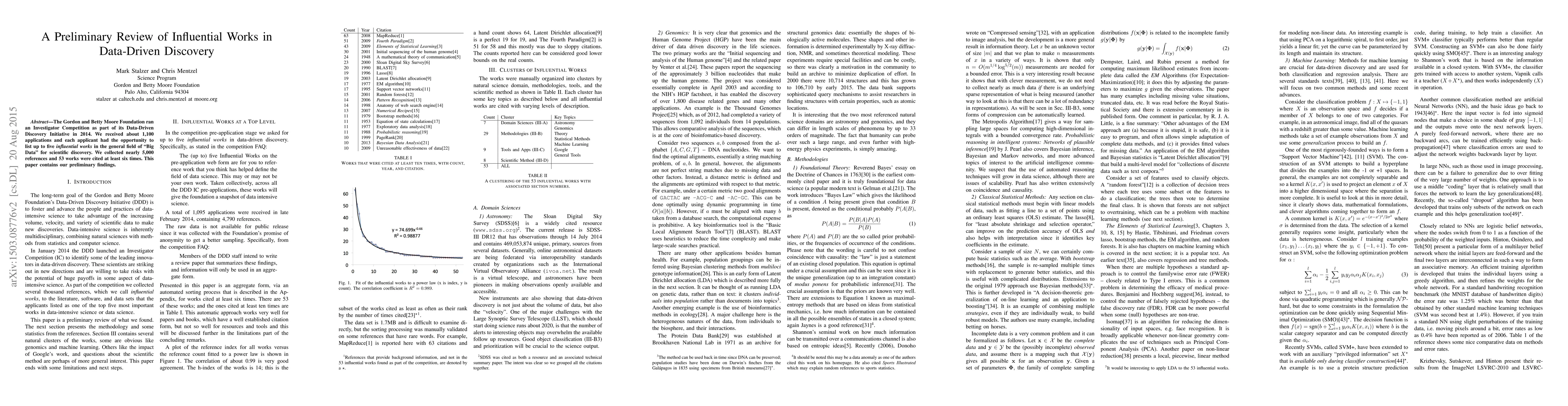 This paper reviews influential works in "Big Data" for scientific discovery, identified through a competition run by the Gordon and Betty Moore Foundation in 2014, where applicants cited up to five impactful papers, resulting in 53 frequently cited works. Preliminary findings highlight the most influential references in the field.
