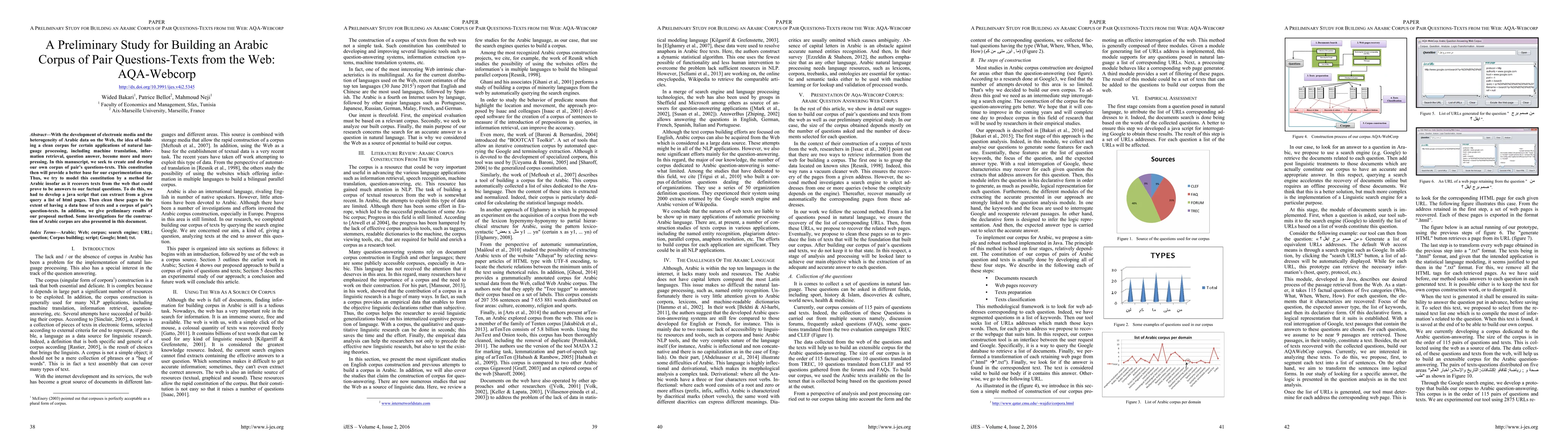 This paper explores the creation of an Arabic corpus of paired questions-texts (AQA-Webcorp) from web data to enhance natural language processing applications. The authors developed a JavaScript tool to extract and clean relevant HTML pages, aiming to provide a robust foundation for future experiments.