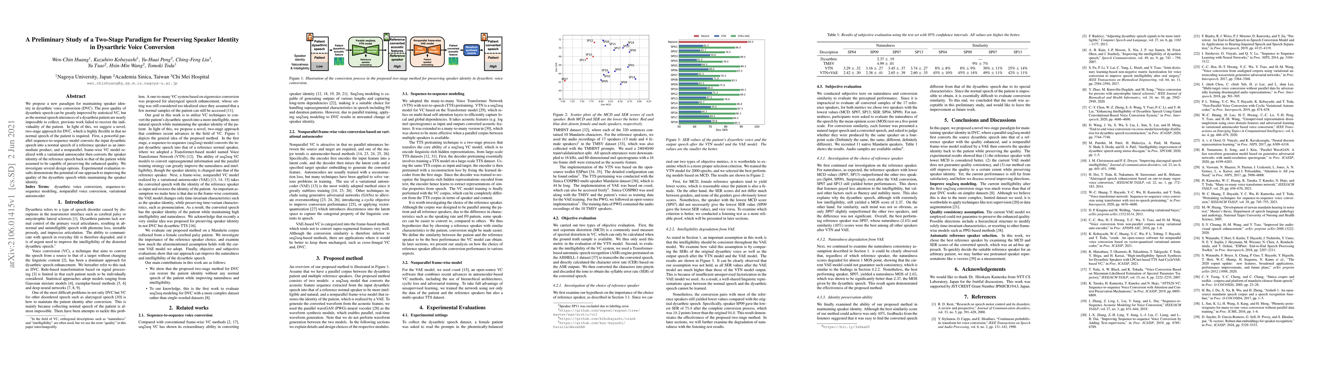 This paper proposes a two-stage paradigm for dysarthric voice conversion that aims to improve the quality of dysarthric speech while preserving the speaker identity, without requiring normal speech samples from the patient. The method uses a sequence-to-sequence model to convert dysarthric speech to normal speech of a reference speaker, followed by a frame-wise model to restore the patient's identity.