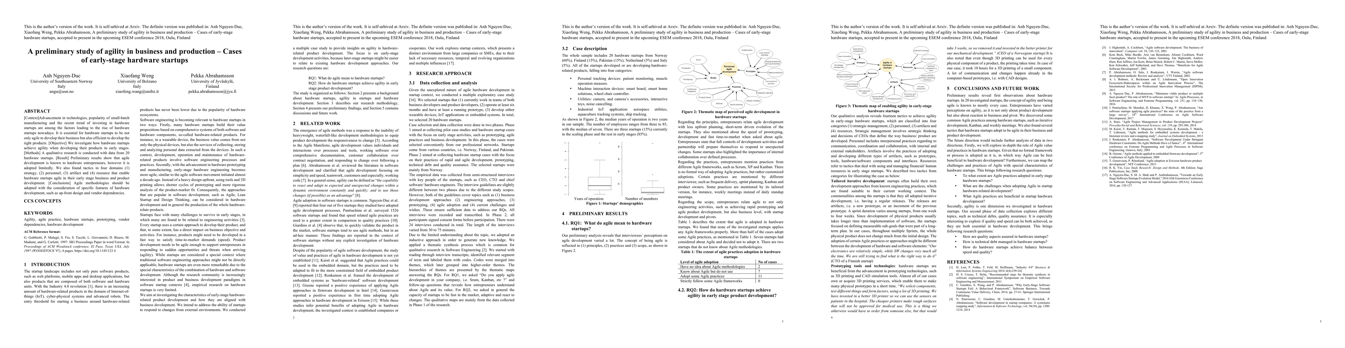 [Context]Advancement in technologies, popularity of small-batch manufacturing and the recent trend of investing in hardware startups are among the factors leading to the rise of hardware startups nowadays. It is essential for hardware startups to be not only agile to develop their business but also efficient to develop the right products. [Objective] We investigate how hardware startups achieve agility when developing their products in early stages. [Methods] A qualitative research is conducted with data from 20 hardware startups. [Result] Preliminary results show that agile development is known to hardware entrepreneurs, however it is adopted limitedly. We also found tactics in four domains (1) strategy, (2) personnel, (3) artifact and (4) resource that enable hardware startups agile in their early stage business and product development. [Conclusions] Agile methodologies should be adopted with the consideration of specific features of hardware development, such as up-front design and vendor dependencies.