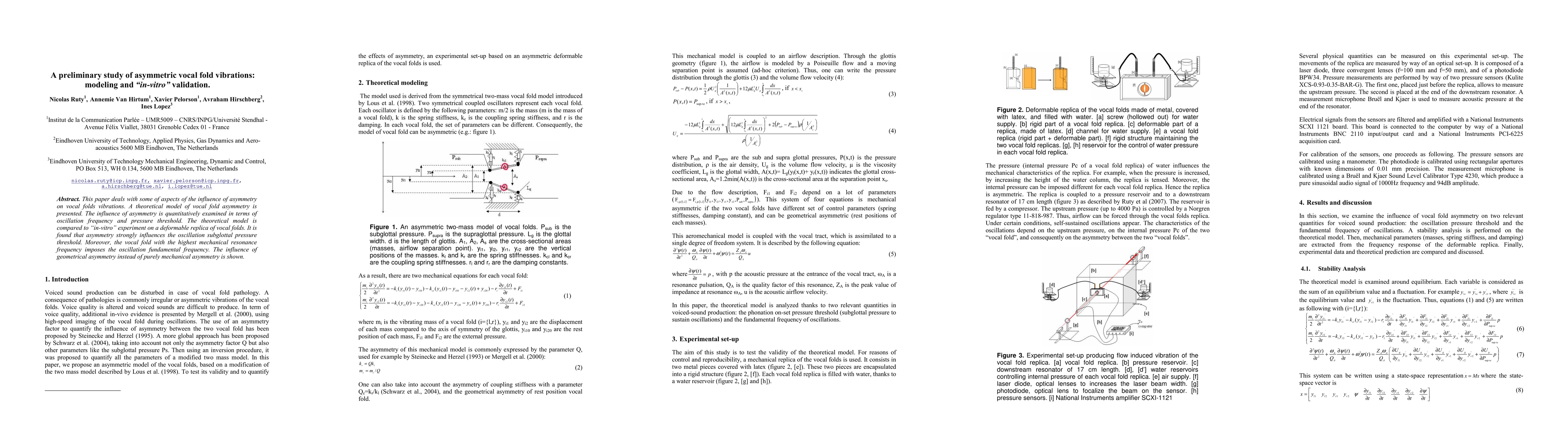 This paper presents a theoretical model of asymmetric vocal fold vibrations and validates it with "in-vitro" experiments. It finds that asymmetry significantly affects the oscillation subglottal pressure threshold and determines the fundamental frequency of oscillation.