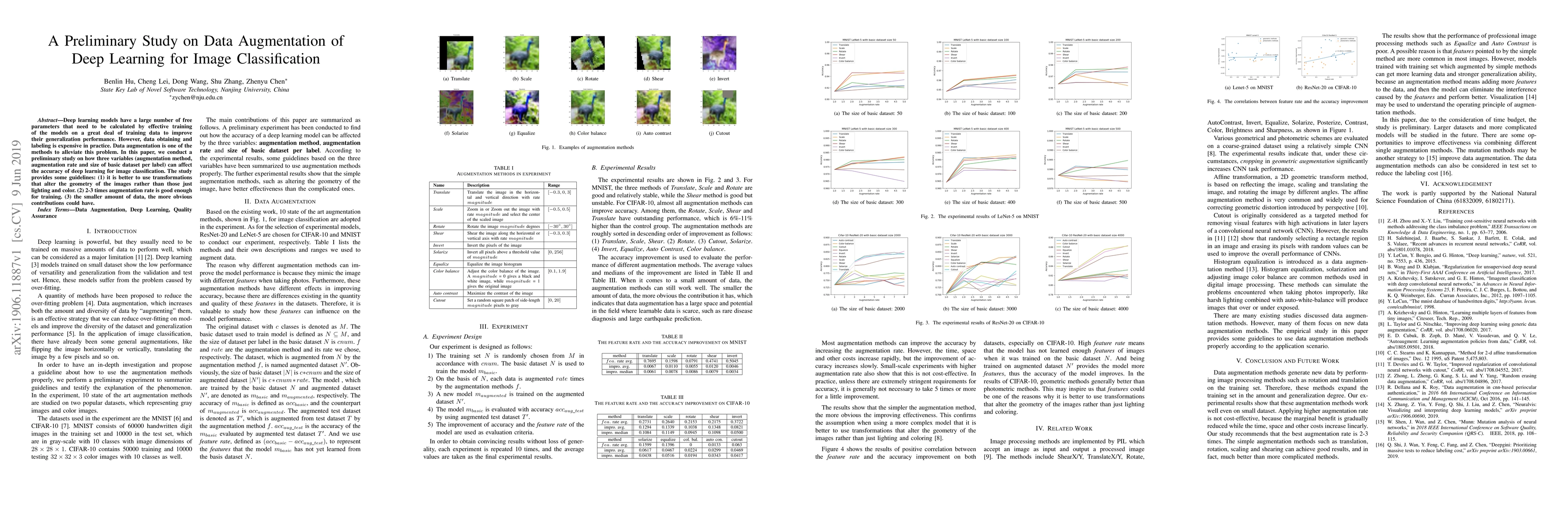 Deep learning models have a large number of freeparameters that need to be calculated by effective trainingof the models on a great deal of training data to improvetheir generalization performance. However, data obtaining andlabeling is expensive in practice. Data augmentation is one of themethods to alleviate this problem. In this paper, we conduct apreliminary study on how three variables (augmentation method,augmentation rate and size of basic dataset per label) can affectthe accuracy of deep learning for image classification. The studyprovides some guidelines: (1) it is better to use transformationsthat alter the geometry of the images rather than those justlighting and color. (2) 2-3 times augmentation rate is good enoughfor training. (3) the smaller amount of data, the more obviouscontributions could have.