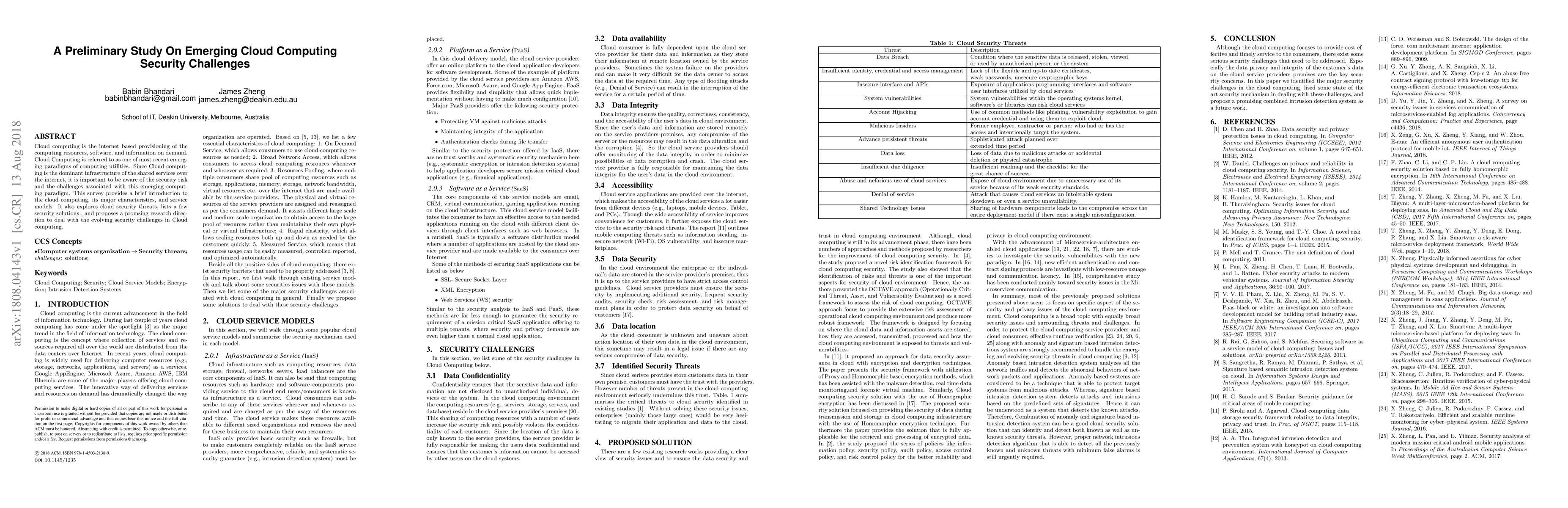 This paper surveys cloud computing's emerging security challenges, outlining its major characteristics and service models, while discussing associated threats and potential solutions. It proposes a promising research direction to address evolving security issues in cloud computing.