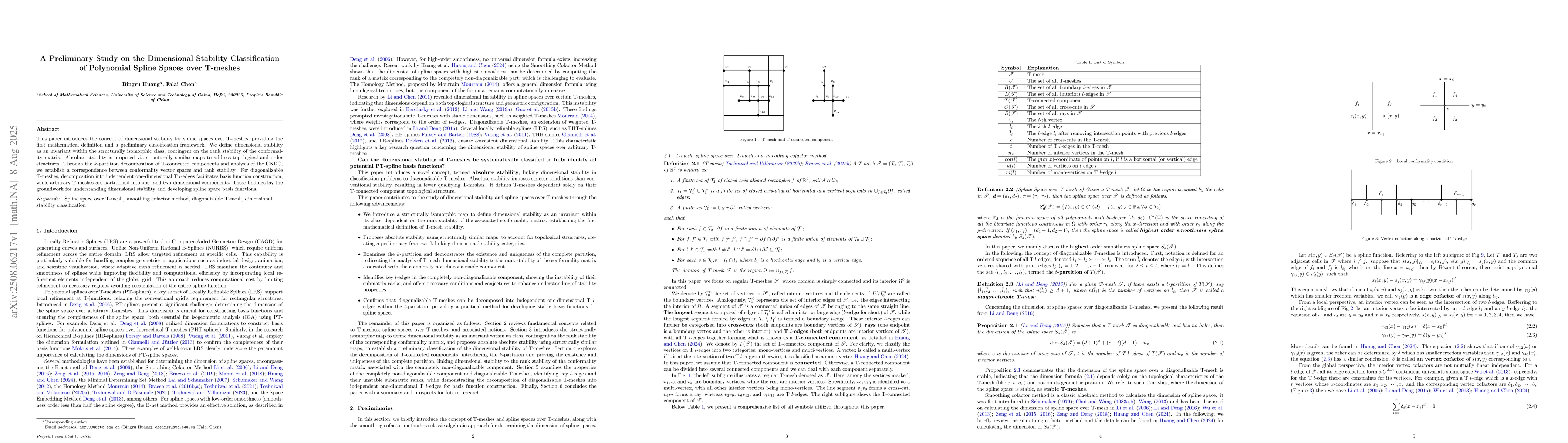 The paper introduces dimensional stability for spline spaces over T-meshes, defining it as an invariant within the structurally isomorphic class, contingent on the rank stability of the conformality matrix. It proposes absolute stability via structurally similar maps to address topological and order structures.