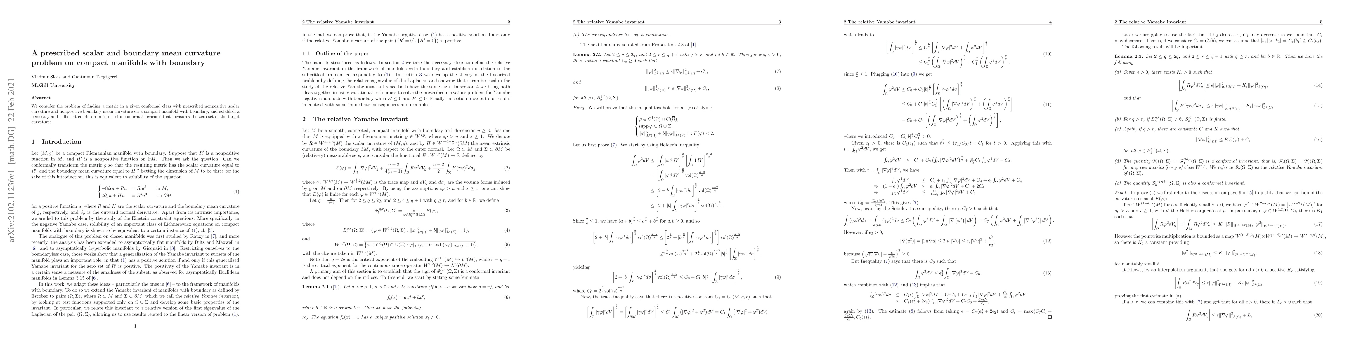 The paper addresses finding a metric with prescribed nonpositive scalar curvature and boundary mean curvature on compact manifolds with boundary, establishing a necessary and sufficient condition using a conformal invariant related to the target curvatures' zero set.