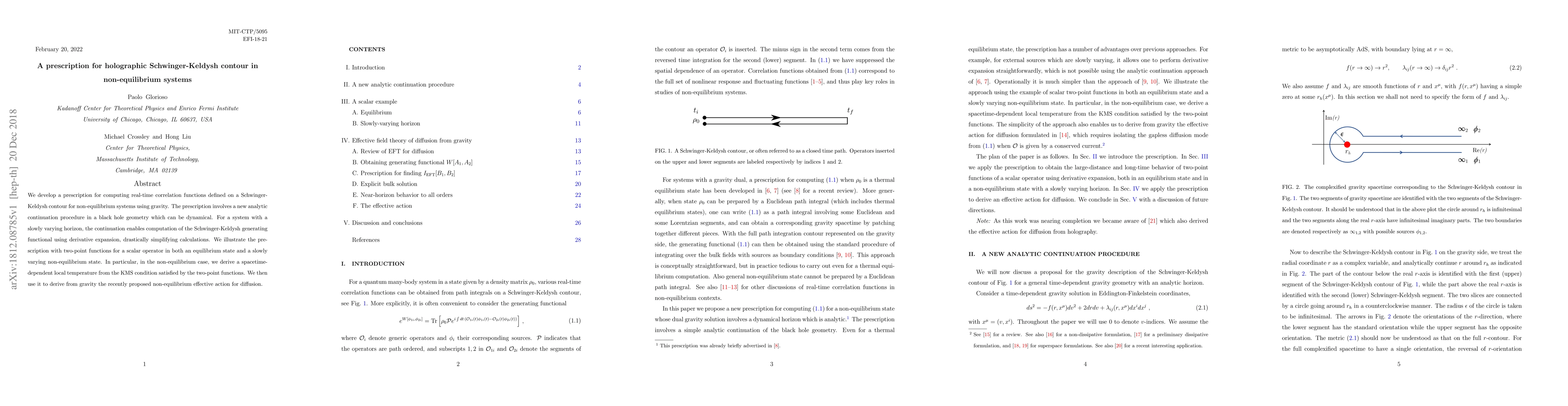 This paper presents a novel prescription for computing real-time correlation functions in non-equilibrium systems via gravity, utilizing a new analytic continuation method in dynamical black hole geometry. It simplifies calculations through a derivative expansion and illustrates the method with scalar operator two-point functions, leading to the derivation of a non-equilibrium effective action for diffusion.