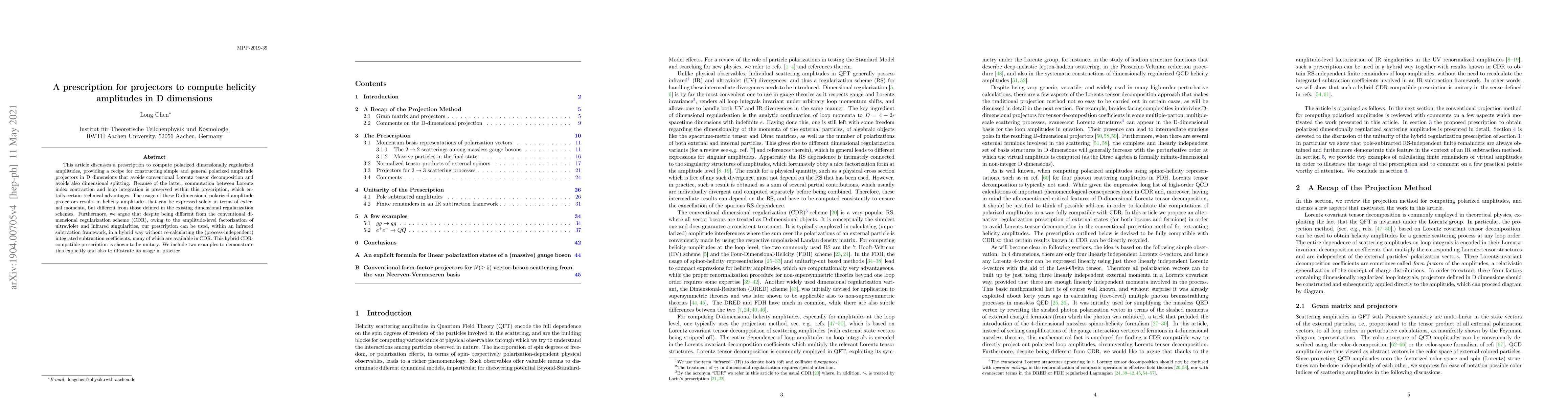 This article discusses a prescription to compute polarized dimensionally regularized amplitudes, providing a recipe for constructing simple and general polarized amplitude projectors in D dimensions that avoids conventional Lorentz tensor decomposition and avoids also dimensional splitting. Because of the latter, commutation between Lorentz index contraction and loop integration is preserved within this prescription, which entails certain technical advantages. The usage of these D-dimensional polarized amplitude projectors results in helicity amplitudes that can be expressed solely in terms of external momenta, but different from those defined in the existing dimensional regularization schemes. Furthermore, we argue that despite being different from the conventional dimensional regularization scheme (CDR), owing to the amplitude-level factorization of ultraviolet and infrared singularities, our prescription can be used, within an infrared subtraction framework, in a hybrid way without re-calculating the (process-independent) integrated subtraction coefficients, many of which are available in CDR. This hybrid CDR-compatible prescription is shown to be unitary. We include two examples to demonstrate this explicitly and also to illustrate its usage in practice.