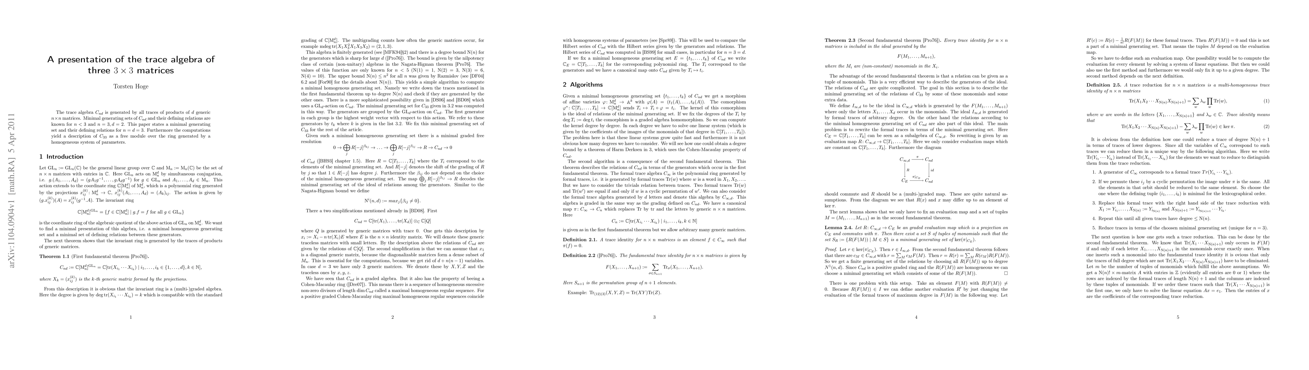 The trace algebra C_{nd} is generated by all traces of products of d generic n x n matrices. Minimal generating sets of C_{nd} and their defining relations are known for n < 3 and n = 3, d=2. This paper states a minimal generating set and their defining relations for n=d=3. Furthermore the computations yield a description of C_{33} as a free module over the ring generated by a homogeneous system of parameters.