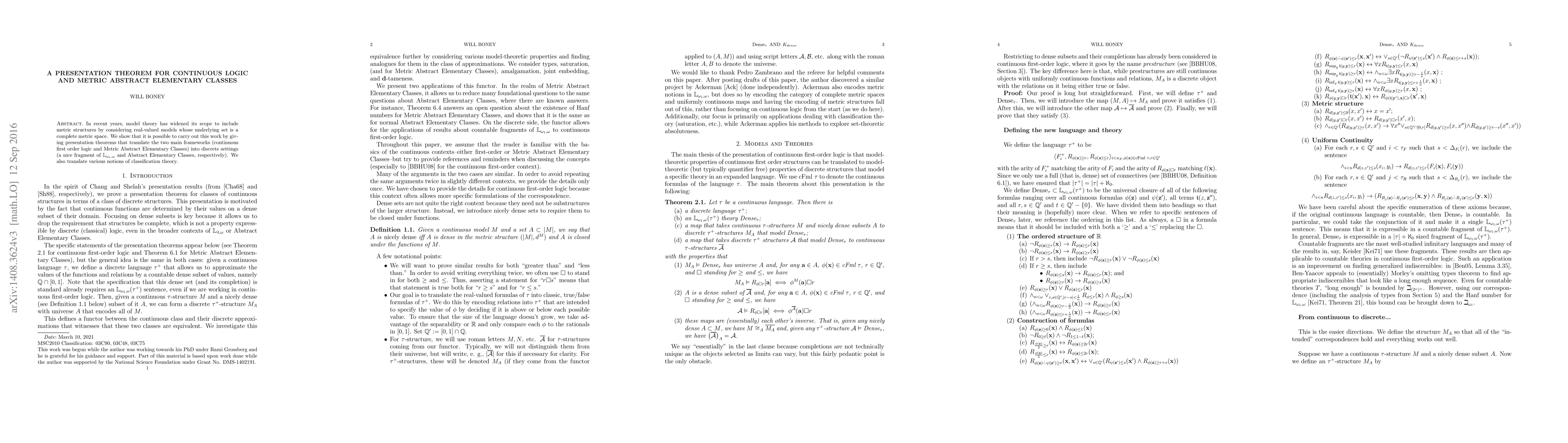 We give a presentation theorem for continuous first-order logic and Metric Abstract Elementary classes in terms of $L_{\omega_1, \omega}$ and Abstract Elementary Classes, respectively. This presentation is accomplished by analyzing dense subsets that are closed under functions. We extend this correspondence to types and saturation.